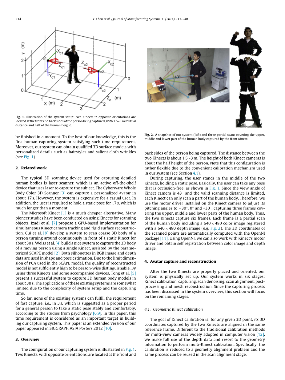 我们的捕获系统配置如图1所示。两个具有相反方向的Kinect位于被捕者的前面和背面。两个Kinect之间的距离约为1.5~3米,相机的高度大约在人的一半的高度上。请注意,由于我们的系统使用了方便的校准机制,因此这种配置非常灵活(参见第4.1节)。