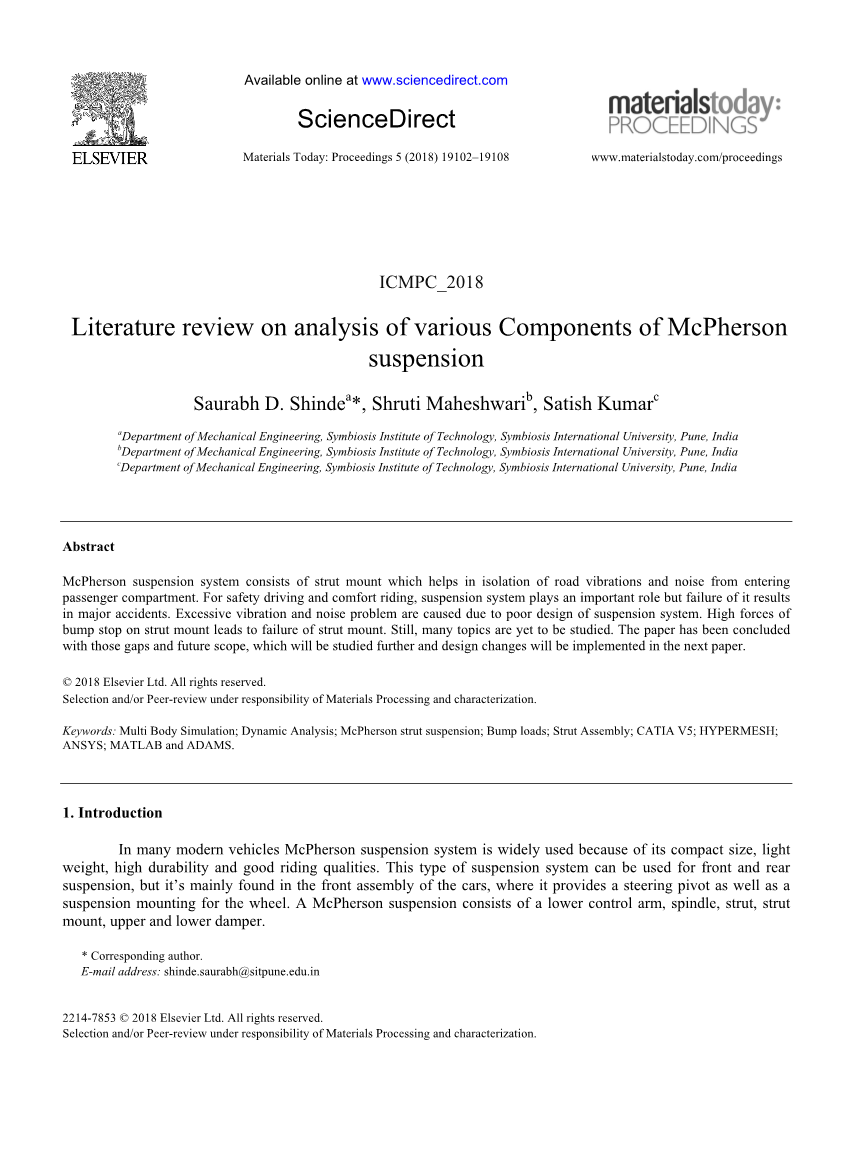 本文是对文献论文的回顾,用于理解先前执行的基于计算机辅助工程的方法,用于模拟麦弗逊悬架系统及其相互连接的各种部件。支柱安装是麦弗逊悬架系统的重要互连部件之一,它经受由于道路颠簸而产生的高力,并且很可能趋于失效。支柱安装可以隔离车辆的轮胎噪音和振动,是连接车辆底盘的安装点。在该文献综述中,研究了先前使用的不同模拟技术,其基于静态,动态使用多体模拟,借助于各种软件进行有限元分析。从评论中可以看出,到目前为止所做的研究趋向于采用动态,疲劳,运动等方法,分别针对麦弗逊悬架系统的不同部件进行处理,如下控制臂,螺旋弹簧,上阻尼器,下阻尼器,枢纽和麦弗逊支柱。