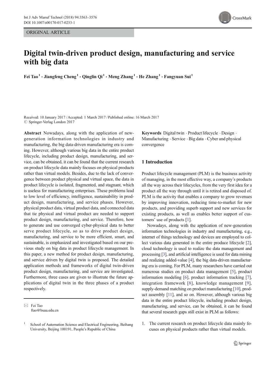 关键词:数字孪生;产品生命周期;设计;制造;服务;大数据;网络和物理融合