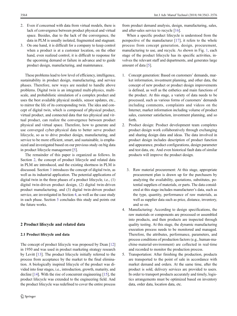 本文的其余部分安排如下。在第二部分中,介绍了产品生命周期的概念以及PLM中的相关数据,并讨论了PLM中现有的不足之处。第三部分介绍了数字孪生的概念及其工业应用。数字孪生在产品生命周期的三个阶段的潜在应用,即(1)数字孪生驱动的产品设计(2)数字孪生驱动的产品制造(3)数字孪生驱动的产品服务在第四部分中进行了研究,以及每个阶段的案例研究。第五部分总结了本研究并指出了未来的工作。