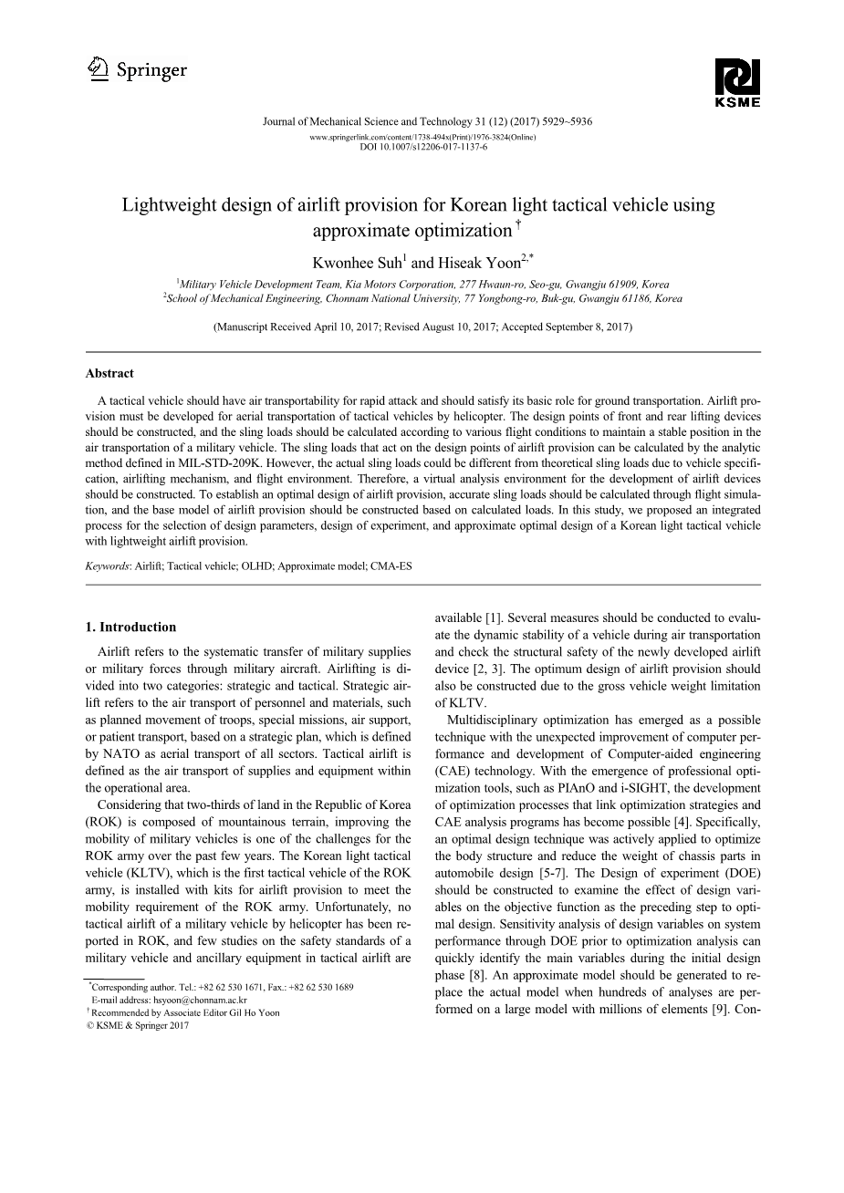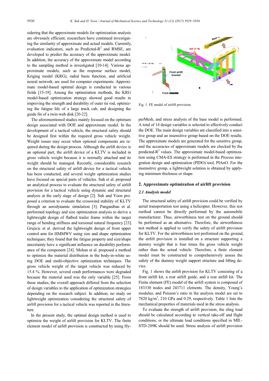 上述研究主要集中在与DOE和近似模型相关的优化设计上。在开发战术车辆时,应首先在所需的车辆总重内设计结构安全性。在设计过程中需要可选组件时,可能会出现重量问题。尽管空运设备是可选部件,但KLTV的空运设备已包含在车辆总重量中,因为它通常是固定的并且应对其重量进行管理。近来,已经对战术车辆用气举装置的结构安全性进行了大量研究,并且一些重量优化研究已集中在车辆的特殊部件上。Suh等。在设计的早期阶段,提出了一种通过动态和结构分析来评估战术车辆空运提供的结构安全性的分析过程[2]。Suh和Yoon提出了通过空气动力学模拟评估KLTV的侧风稳定性的标准[3]。Panganiban等。进行了拓扑和尺寸优化分析,得出了在弯曲刚度和扭转固有频率目标范围内平板拖车框架的轻量化设计[23]。Grujicic等。利用尺寸和形状优化技术推导出HMMWV的前上控制臂的轻量化设计;他们发现疲劳性能和尺寸/形状不确定性对组件的耐久性能有重要影响[24]。Mohan等。提出了一种利用DOE和多目标优化技术优化白车身材料分布的方法。目标车辆的总车重减少了15.4 %.但是,一些崩溃性能下降了。因为使用的材料是唯一的变量[25]。从这些研究中,根据研究对象的不同,总体方法从设计变量的选择到优化策略的应用有所不同。另外,在文献中没有报道考虑到战术车辆的空运提供的结构安全性的轻量化优化研究。