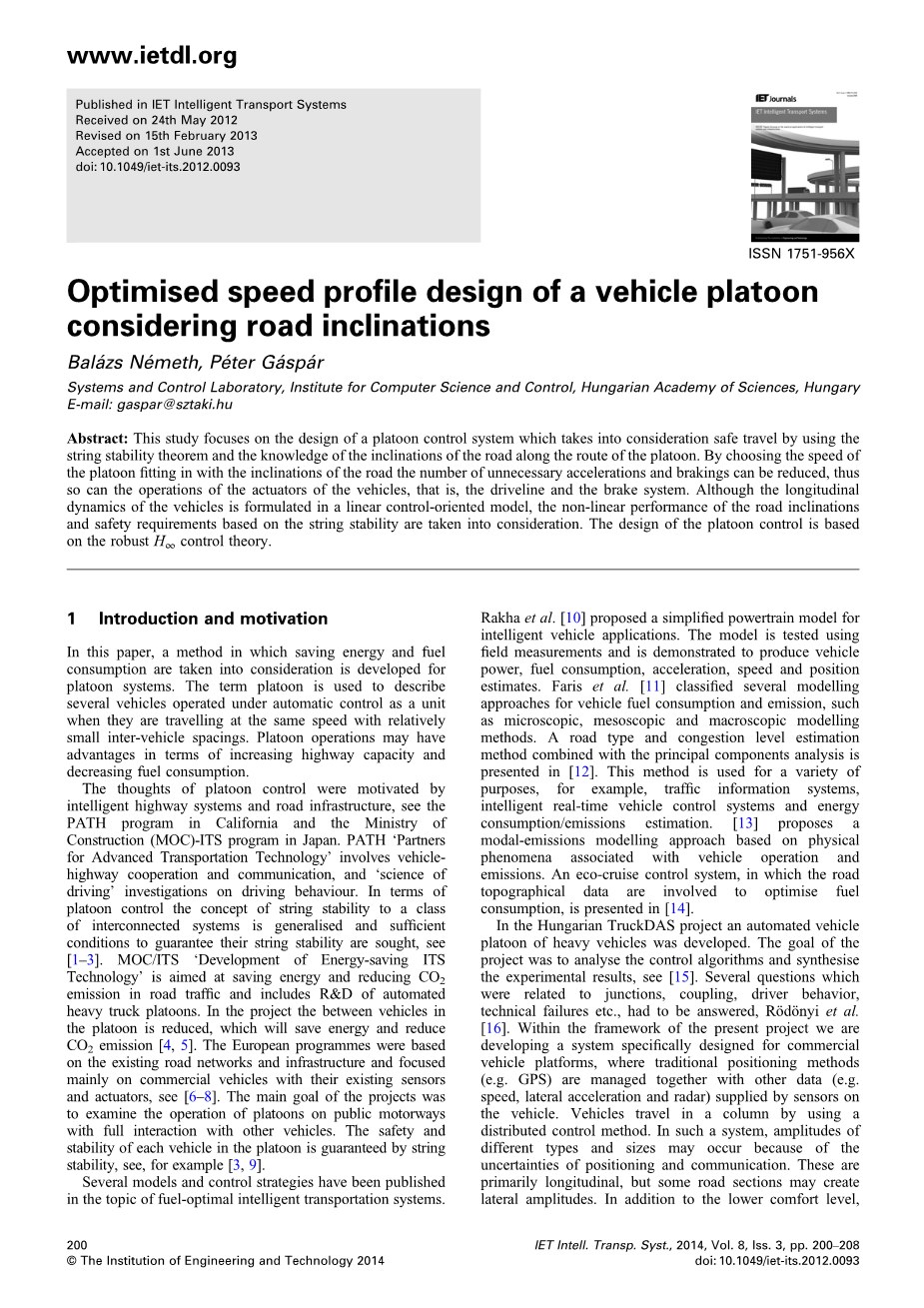 在《燃料最优智能交通系统》这一专题中,已经发表了一些模型和控制策略。Rakha等人提出了一种简化的智能车辆动力系统模型。该模型通过现场测量进行了测试,并演示了车辆功率、燃料消耗、加速度、速度和位置的估计。Faris等人对车辆油耗和排放的几种建模方法进行了分类,如微观、中观和宏观建模方法。在[12]中提出了一种结合主成分分析的道路类型和拥堵等级估计方法。该方法可用于多种用途,如交通信息系统、智能实时车辆控制系统和能源消耗/排放估算。[13]提出了一种基于车辆运行和排放物理现象的模型排放建模方法。在[14]中提出了一个生态巡航控制系统,该系统利用道路地形数据优化油耗。