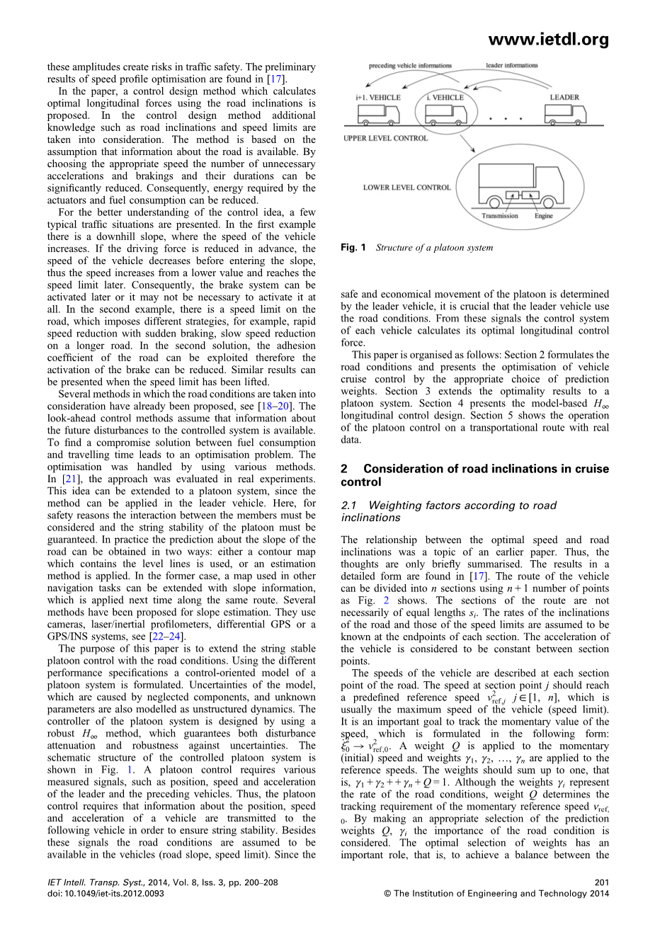 本文的目的是将稳定的队列控制扩展到有条件的路面。利用不同的性能指标,建立了面向控制的队列系统模型。模型的不确定性由忽略的分量和未知的参数引起,也被建模为非结构化动力学。采用鲁棒法设计了队列系统的控制器,既保证了系统的抗干扰能力,又保证了系统对不确定性的鲁棒性。控制队列系统的结构示意图如图1所示。队列控需要各种测量信号,如前车和前车的位置、速度和加速度。因此,队列控制要求将车辆的位置、速度、加速度等信息传递给后续车辆,以保证队列的稳定性。除了这些信号之外,假设道路状况在车辆中可用(道路坡度,速度限制)。由于领航车决定着整个队列的安全、经济运行,因此领航车使用道路条件至关重要。根据这些信号,每个车辆的控制系统可以计算其最优纵向控制力。