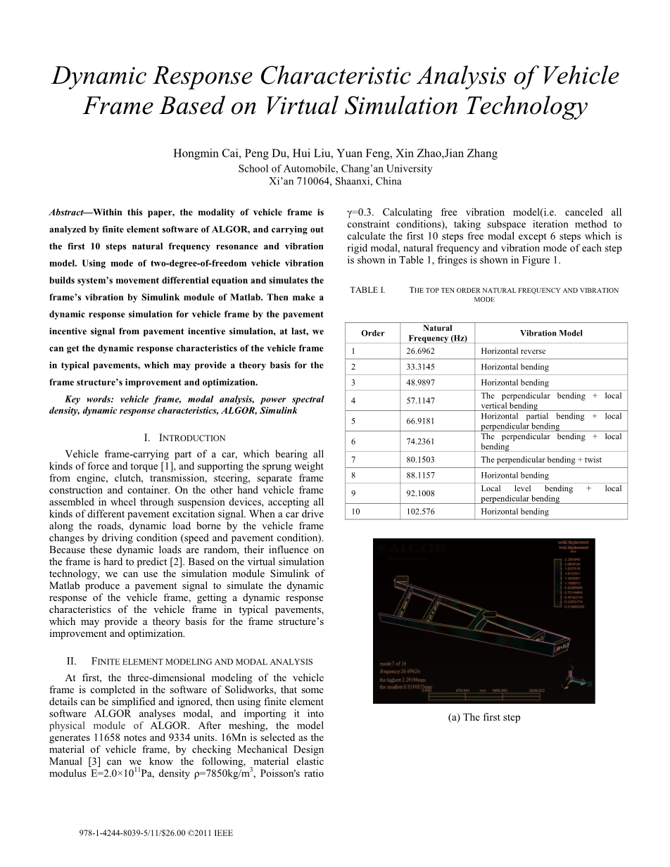 关键词:车架,模态分析,功率谱密度,动态响应特性,ALGOR, Simulink