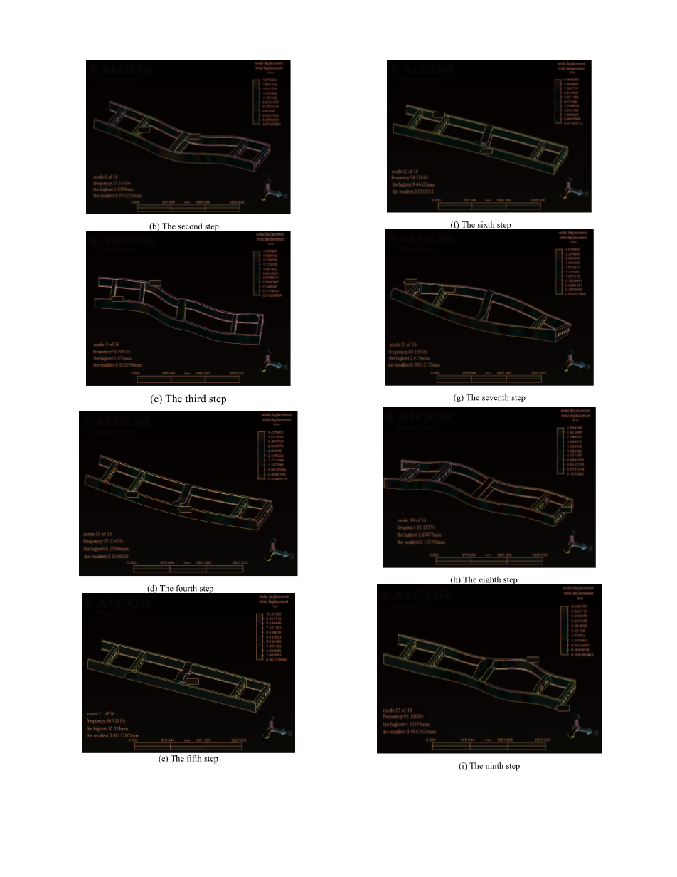 首先,在Solidworks软件建立车架的三维模型,一些细节可能会被简化或者忽略,然后用有限元分析软件ALGOR进行模态分析,并导入ALOGOR的物理模块中。啮合之后,模型共有11658个标记和9334个单元。选择16Mn作为车架的原料,通过查阅机械设计手册我们可以知道,原料的弹性模量E=2.0times;1011Pa,密度rho;=7850kg/m3,泊松比gamma;=0.3.计算自由振型模型(取消所有约束条件),采用子空间迭代法计算前10步自由模态,仅6步为刚性模态。每一步的固有频率和振动模式如表1所示,条纹如图1所示。