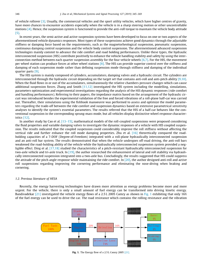 近年来,随着能源问题的日益突出,能源回收技术越来越受到人们的重视。对于汽车来说,只有少量的燃料能量可以转化为驱动动能。Bandivadekar[21]研究了图1所示的2.5 L 2005款凯美瑞汽车的能量流,结果显示只有16%的燃料能量可以用来驱动汽车。包含滚动阻力和路面不平度引起的振动阻力的道路阻力消耗了4%的驱动能量,馈能悬架可以获得汽车悬架中耗散的能量。Abdelkareem等人[22-24]评估了阻尼器件的能量收集潜力,并对潜在的能量收集和车辆动力学进行了广泛的参数敏感性和冲突分析。结果表明,考虑到标准的驾驶模式和横摇激励,可以收集到420w的潜在功率,表明超载车辆适用于能量收集系统。基于文献[25]中的实车行驶试验,作者对哈弗H8轿车右后悬架在20-50km/h的行驶速度范围内的可收获功率势进行了实验估算,结果表明,对于SUV乘用车,每个减振器项可获得140W的可收获功率。