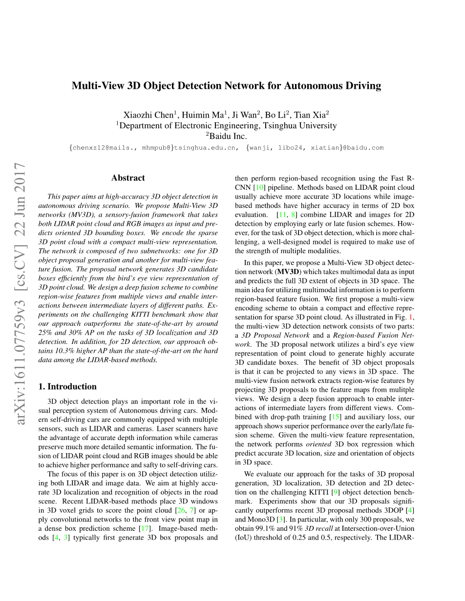 这篇文章旨在介绍一种面向自动驾驶场景的高精度3D目标检测方法。我们提出了多视图3D网络(MV3D),一种以激光雷达点云和RGB图像作为输入,然后预测物体有向3D边界框的传感融合框架。我们将稀疏的3D点云编码为稠密的多视图。该网络由两个子网络组成:一个子网用于生成候选3D边界框,另一个子网用于多视角信息的融合。推荐网络有效的从点云的鸟瞰图上生成3D候选边界框。我们设计了一种深度融合的方案,以结合多个视图中的区域特征,并实现不同路径中间层之间的融合。在KITTI的基准测试中的,实验表明我们方法在3D定位任务中的准确率比当前最新的方法高大概25%,在3D检测任务中高大概30%。另外,在基于激光雷达的2D目标检测任务中我们方法的准确率也比当前最新的办法高出10.3%.