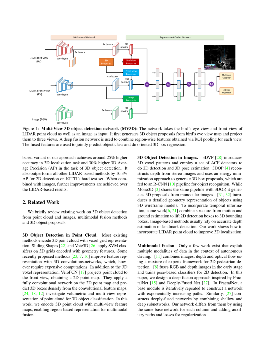 本文的重点是同时利用激光雷达和图像数据进行3D目标检测。我们希望在道路场景下获得高精度的3D定位和物体识别。最新基于激光雷达的方法将3D窗口放置在3D体素网格中来对点云进行打分[26,7]或者将卷积网络应用到稠密的点云前视图上获得边界框预测[17]。基于图像的方法通常先生成3D提议边框然后使用Fast R-CNN[10]进行区域的识别。基于点云的方法通常能够获得的更加准确的3D位置,而基于图像的方法则在2D边界框的评估中有更高的准确率。[11,8]通过激光雷达和图像的早期融合和晚期融合进行2D检测。但是对于更加具有挑战性的3D目标检测任务,一个设计良好的模型需要能够充分的利用各个模态的优势。