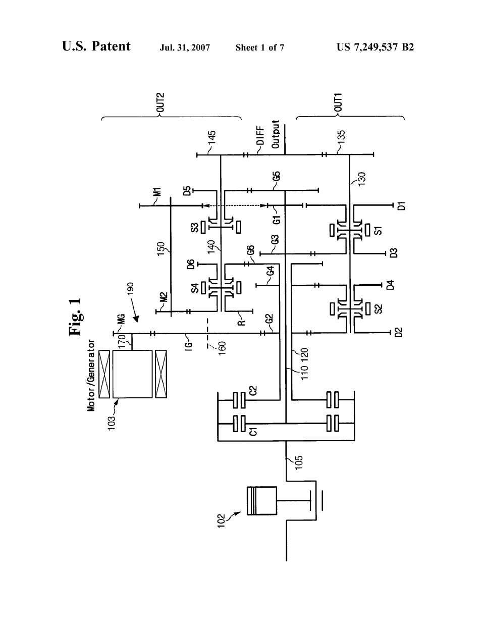 马达输入/输出单元190通过马达齿轮MG、马达空转齿轮IG和第二输入轴120上的第二驱动齿轮G2,将马达103(即,可操作用于驱动和生成功能的马达发电机)的扭矩选择性地传送到设置在变速箱(未示出)上的第二输入轴120。电机齿轮MG设置在其旋转轴170上的电机103上。马达空转轴160与第二输入轴120平行并相隔预定距离布置。在马达怠速轴160上,马达怠速齿轮IG被布置,同时与马达齿轮MG和第二输入轴120上的第二驱动齿轮G2接合。