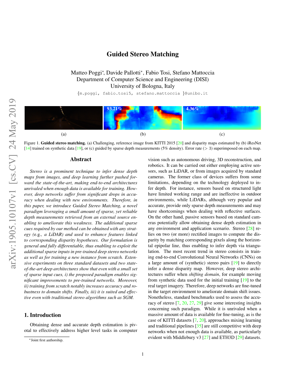 在图1中,我们可以注意到一个非常有难度的来自2015年KITTI [20]的立体模型从(a),一个用合成数据训练的先进深度立体网络产生的不准确的视差地图(b),同时尽管映射域迁移,考虑到更准确的结果(c),用我们的方法引导时只部署了5%的稀疏深度数据。