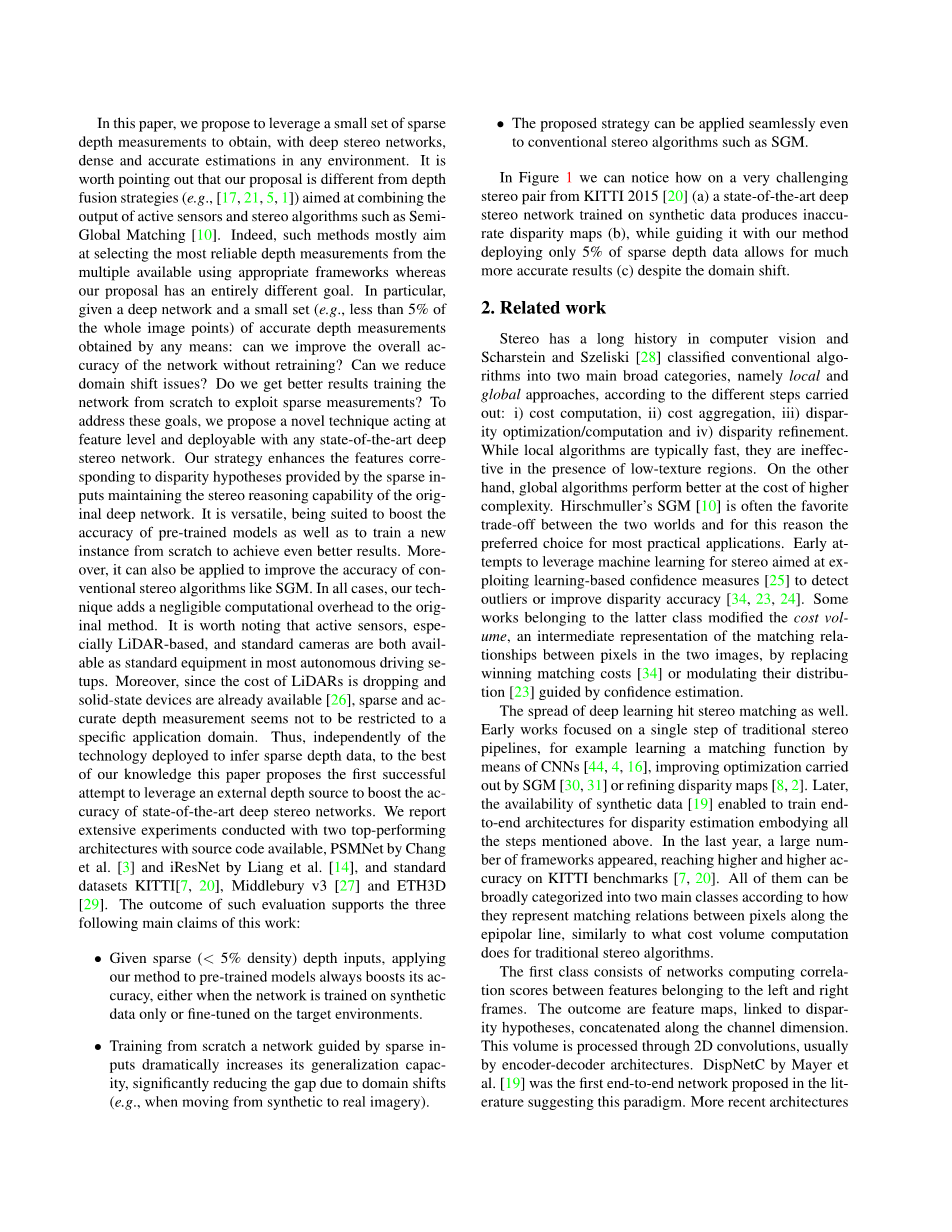 获得密集而准确的深度估计对于有效地处理计算机中较高级别的任务至关重要。比如自动驾驶、3D重建和机器人技术。它既可以使用诸如激光雷达等主动传感器,也可以使用标准相机获取的图像。前一类设备受到一些限制,这取决于用来深度估计的技术。例如,基于结构光的传感器工作范围有限,在室外环境中会失效,而激光雷达虽然非常流行和准确,但只能提供稀疏的深度测量,在处理反射表面时可能有缺陷。另一方面,基于标准相机的无源传感器有可能在任何环境和应用场景中获得稠密深度估计。立体视觉[28]依赖于两个(或多个)经过校正的图像,通过沿水平极线匹配相应的像素来计算视差,从而能够通过三角测量来推断深度。立体视觉最近的趋势是在大量的(合成的)立体图像对[19]上训练端到端卷积神经网络(CNNs)来直接推断一个稠密视差图。然而,深度立体架构在映射域移位时受到影响,例如从用于初始训练[19]的合成数据移动到实际目标图像。因此,在目标环境中对深度网络进行微调,以改善域位移问题。尽管如此,用于评估立体视觉精度的标准基准[7,20,27,29]给出了关于这种示例的一些有趣的见解。虽然大量数据可微调时是万能的,就像KITTI数据集(7、20), 在深度网络没有足够的数据可用时混合学习方法和传统途径[35]仍存在竞争,Middlebury v3 [27] 和ETH3D[29]数据集就尤其明显。