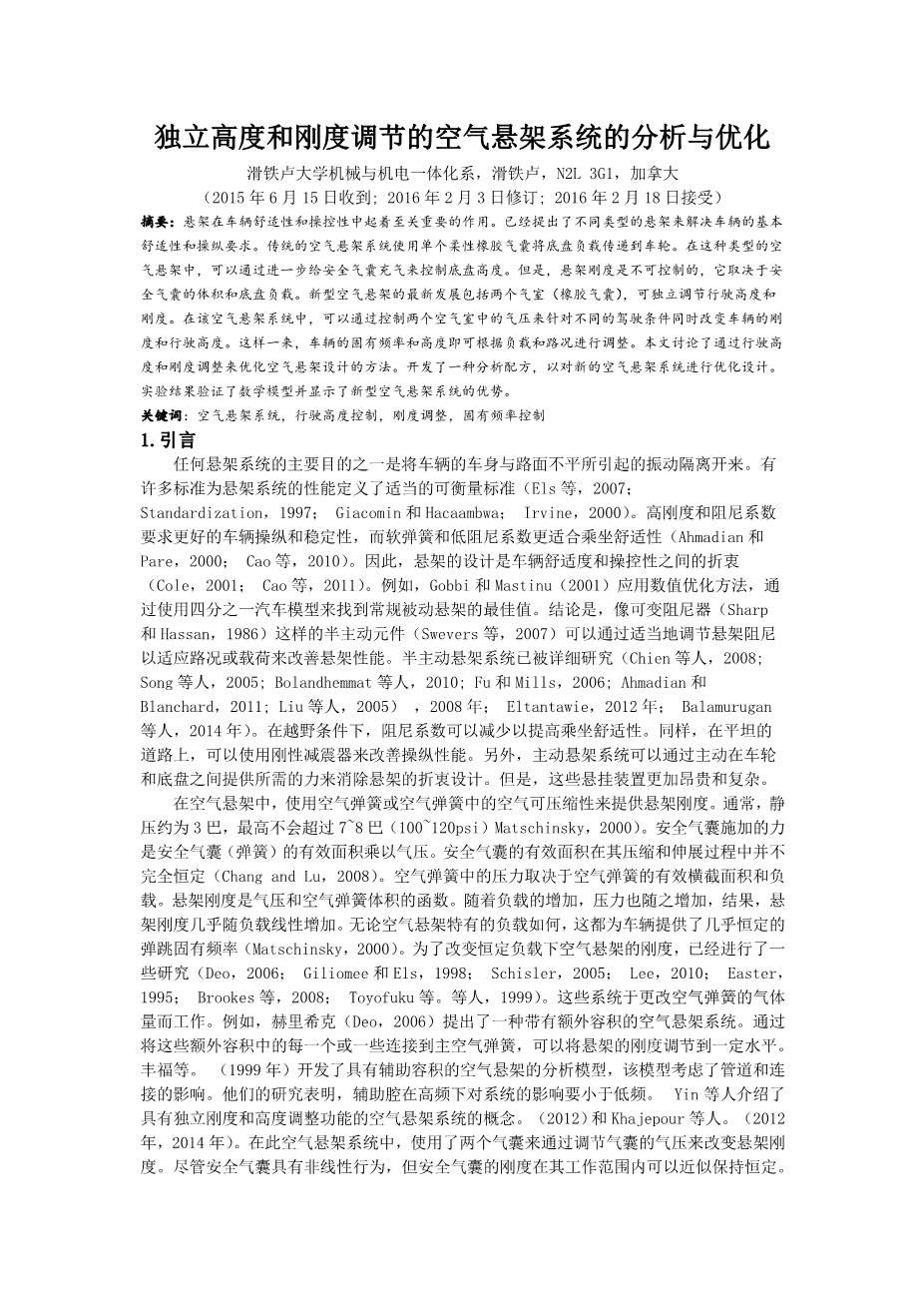 独立高度和刚度调节的空气悬架系统的分析与优化外文翻译资料 2022-08-13 15:08:41 英语原文共 10 页,剩余内容已隐藏,支付完成后下载完整资料 英语译文共 14 页,剩余内容已隐藏,支付完成后下载完整资料 资料编号:[236207],资料为PDF文档或Word文档,PDF文档可免费转换为Word 原文和译文剩余内容已隐藏,您需要先支付 30元 才能查看原文和译文全部内容!立即支付 发小红书推广免费获取该资料资格。点击链接进入获取推广文案即可: Ai一键组稿 | 降AI率 | 降重复率 | 论文一键排版 PREVIOUS NEXT 您可能感兴趣的文章 噪音和振动测量外文翻译资料 主动式横向稳定杆在车辆平顺性和稳定性上的应用外文翻译资料 干摩擦离合器系统的应力与变形分析外文翻译资料 电动转向模拟器的虚拟样机外文翻译资料 主动前转向系统控制策略研究外文翻译资料 横向冲击对汽车乘客颈椎反应的三维分析.外文翻译资料 对机车意外事故中新型胸腔安全系统的评估外文翻译资料 电动车动力传动系统性能分析解析算法的发展外文翻译资料 扁钢表面缺陷的自动检测:综述外文翻译资料 非线性规划二:无约束优化技术外文翻译资料