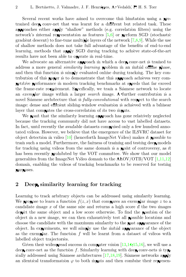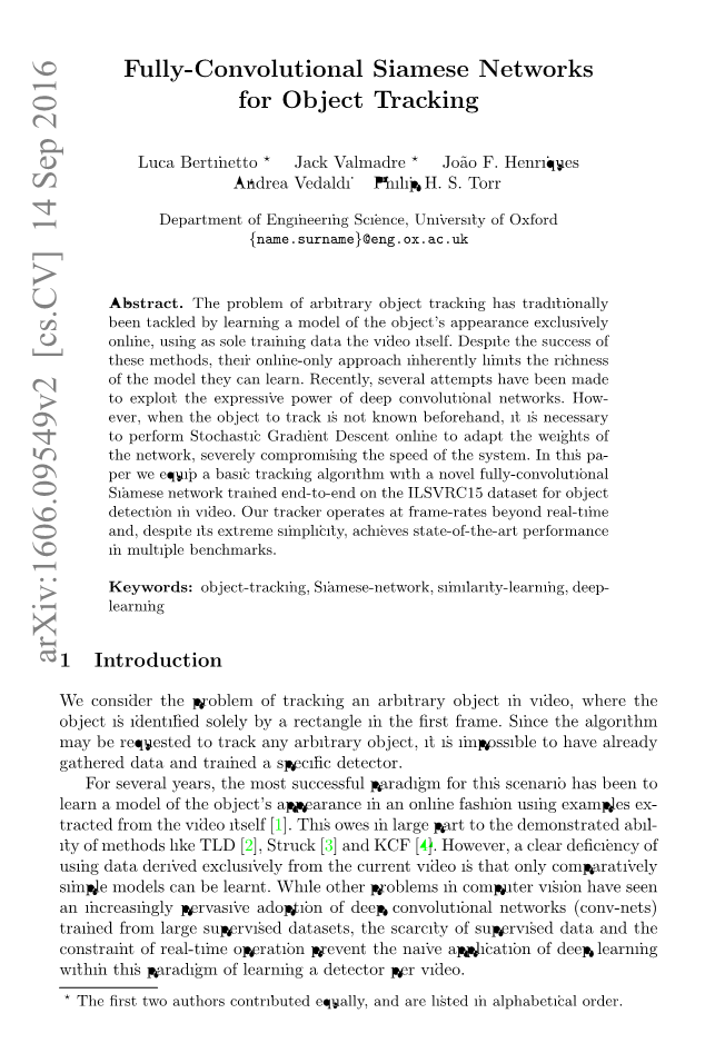 摘要:任意目标跟踪的问题传统上是通过在线学习目标的外观来解决的,并且用视频本身作为唯一的训练数据。尽管这些方法取得了成功,但它们只能在线上使用的方法从本质上限制了它们可以学习的模型的丰富程度。最近,人们数次尝试去开发深度卷积网络的表现力。但是,当被跟踪的目标之前是不了解的时候,为了适应网络的权值,需要在线进行随机梯度下降,这严重影响了系统的速度。本文在ILSVRC15数据集上,采用端到端训练的全卷积Siamese网络,实现了一种基本的视频目标检测跟踪算法。我们的跟踪器以超越实时的帧速率运行,尽管它非常简单,但在多个基准测试中都达到了最先进的性能。