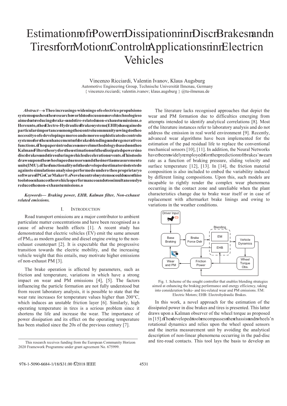 在这项工作中,提出了一种新颖的方法来估算盘式制动器和轮胎的耗散功率。后者借鉴了[15]中提出的车轮扭矩的卡尔曼观测器。所开发的工具涵盖了底盘和车轮的转动动力学,并依靠车轮速度传感器和惯性测量单元,避免了对盘面和轮胎路面接触处出现的非线性现象的分析描述。该工具为基于增强制动性能和能效并同时减少PM排放的标准制定的最佳制动控制策略奠定了基础(图1)实际上,基于“能量粒子发射率”[5]和根据特定粒子范围的实验定义的的方法,可能用于估算从滑动接触中发射出来的磨损粒子的数量。