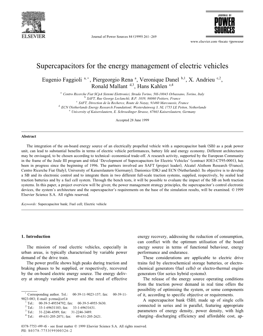 摘要:配备有作为最高能量单元的超级电容器组的电动车辆上的车载能源集成,可以在电动车辆的性能、电池寿命和能量经济性方面为我们带来实际的效益。我们可以根据技术性和经济性之间的权衡,来选择我们所能设想到的不同的结构。一个在焦耳Ⅲ项目下进行的由欧共体扶持的研究活动,其被命名为“电动车辆车载超级电容器的发展”(JOE3-CT95-0001条约),从1996年成立至今 一直进行着。他们的合作伙伴包括帅德福电池有限公司(项目领导者),阿尔卡特 - 阿尔斯通集团研究所(法国),菲亚特技术研究中心(意大利),凯撒斯劳滕工业大学(德国),电池生产商丹尼奥尼克斯(丹麦)和能源研究中心(荷兰)。该研究活动的目的是研究发展超级电容器组和其电子控制技术,并且将二者综合运用到两个分别由封闭主电源动力蓄电池电路和燃料电池系统供能的全面的动力系统。通过台架试验,验证了评估两个动力系统中的超级电容器组的效应这一行动是可行的。本文对这一项目进行了综述;测试验证能量管理策略原则,超级电容器电子控制装置,系统的框架结构和超级电容器基于仿真结果的要求。copy;1999爱思唯尔科学期刊杂志机构保留一切权利。