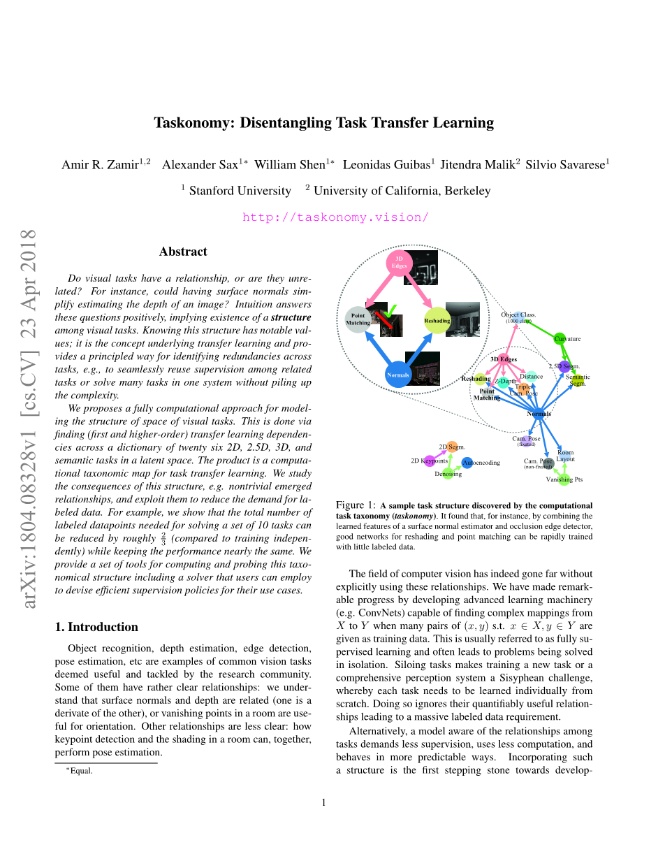 视觉任务是否有关系,或者它们是否没有关系? 例如,表面法线是否可以简化估算图像的深度?直觉回答了这些问题,暗示了视觉任务中存在结构。发现这种结构有显著的价值; 它传递学习的基本概念,并提供了一种原则性的方法来识别任务之间的冗余,例如,无缝地重用相关任务之间的监督或在一个系统中解决许多任务而不会增加复杂性。