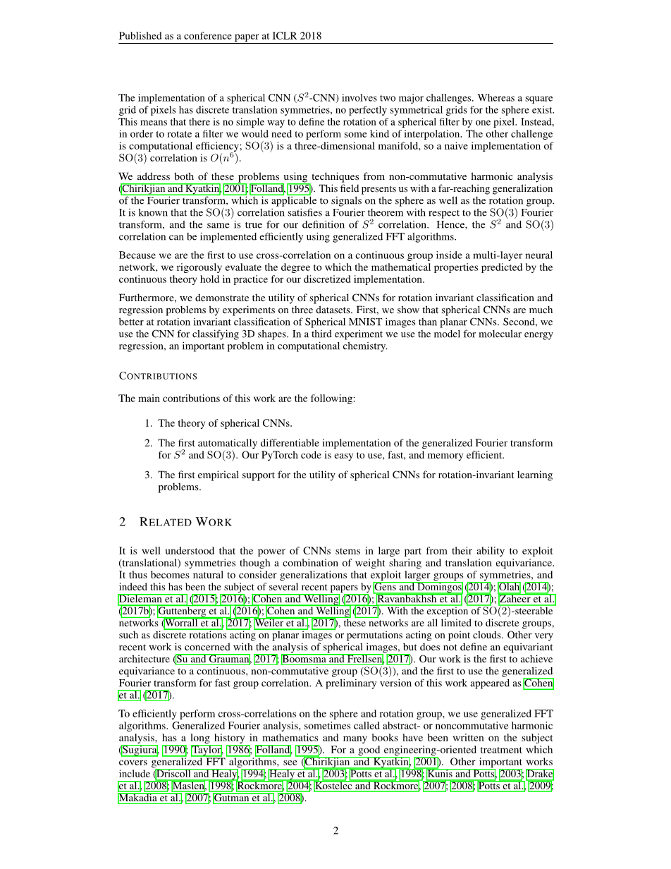 众所周知,CNN的力量很大程度上源于其利用(平移)对称性的能力,而这种对称性是权重分担和平移方差的结合。因此,考虑利用更大对称群的概括是很自然的,事实上,这是Gens和Domingos(2014年)最近几篇论文的主题;Olah(2014年);Dieleman等人(2015;2016);Cohen和Welling(2016);Ravanbakhsh等人(2017年);Zaheer等人(2017b);Guttenberg等人(2016年);Cohen和Welling(2017年)。除了SO(2)可控制网络(Worrall等人,2017年;Weiler等人,2017年),这些网络都局限于离散组,例如作用于平面图像的离散旋转或作用于点云的排列。其他最近的工作涉及球面图像的分析,但没有定义等变结构(Su和Grauman,2017年;Boomma和Frellsen,2017年)。我们的工作是第一次实现对连续非交换群(so(3))的等方差,第一次使用广义傅立叶变换进行快速群相关。这部作品的一个初步版本是由Cohen等人提出的。(2017)。