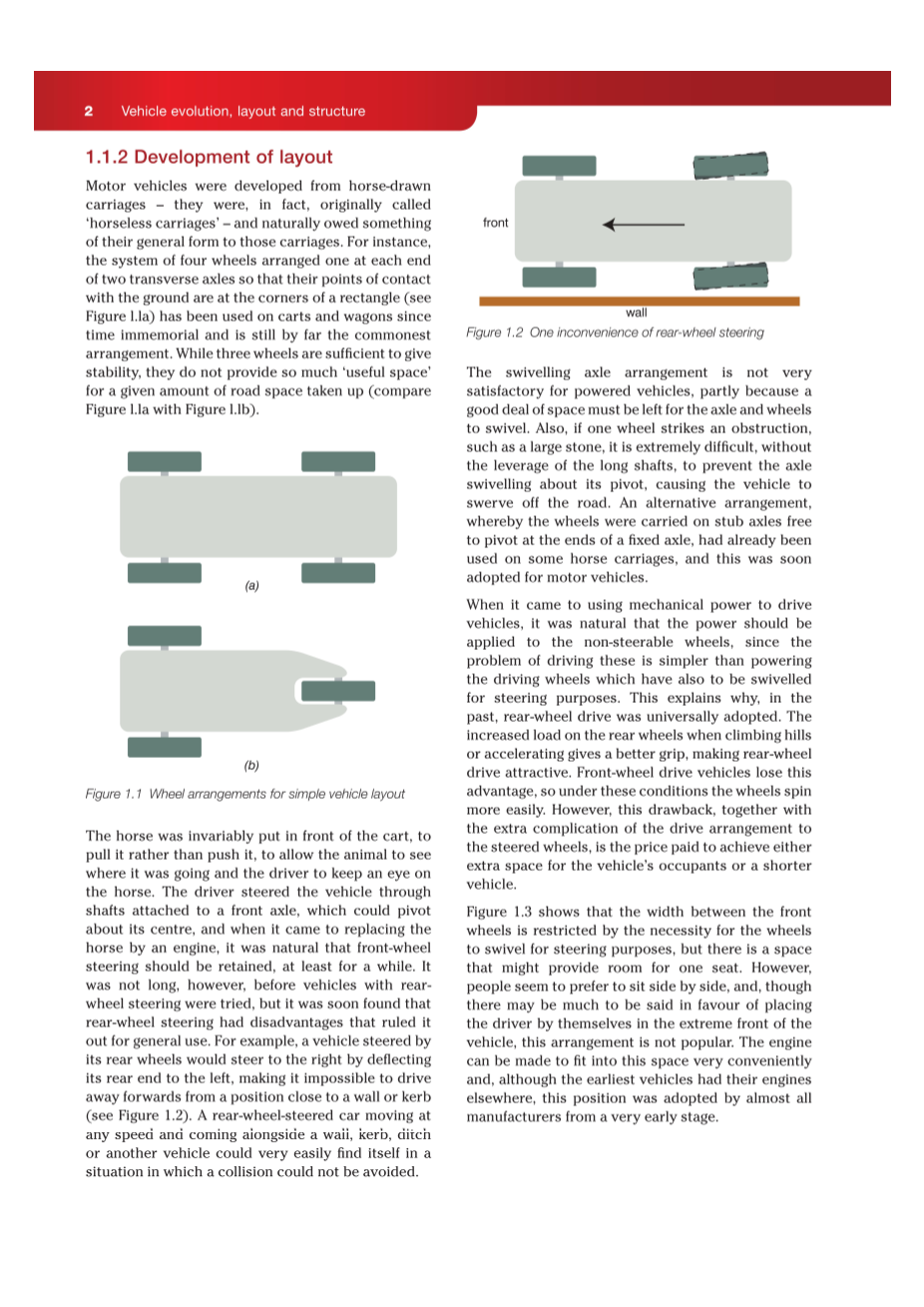 旋转轴装置对于动力车来说效果并不是非常的令人满意,部分原因是必须留下足够的空间来使车轴和车轮旋转。而且,如果一个车轮撞到了障碍物,例如大石头,则在没有长轴杠杆作用的情况下,防止车轴绕其枢轴旋转会非常困难,从而导致车辆偏离道路。一种可用来替代的装置是将轮子承载于固定轴端部自由枢转的短轴上,这种装置在之前已经运用在了一些马车上,并且这很快就被运用在了机动车辆上。当使用机械动力驱动车辆时,应该将动力施加到不可转向的车轮上,因为给这些车轮提供动力的问题要比为既转向又驱动的车轮提供动力更简单。这就解释了为什么在过去,后轮驱动被普遍得采用。爬山或加速时后轮上负载的增加可提供更好的抓地力,使后轮驱动更具吸引力。前轮驱动车辆没有这一优势,因此在这些条件下车轮更容易旋转。然而,如果想要实现车辆乘员或较短车辆获得额外的空间,这个缺点以及转向轮上驱动装置的额外复杂性是必须付出的代价。图1.3显示了前轮之间的宽度受到车轮转向时的必要转向的限制,但是却有个可提供一个座位的空间。然而,人们似乎更喜欢并排而坐,而且,尽管有很多人赞成让司机自己坐在汽车的最前面,但这种安排并不受欢迎。因此发动机便被安排在了这里,发动机可以很方便地进入这个空间,虽然最早的汽车在其他地方也有发动机,但几乎所有的制造商从很早的阶段就采用了这个位置。
