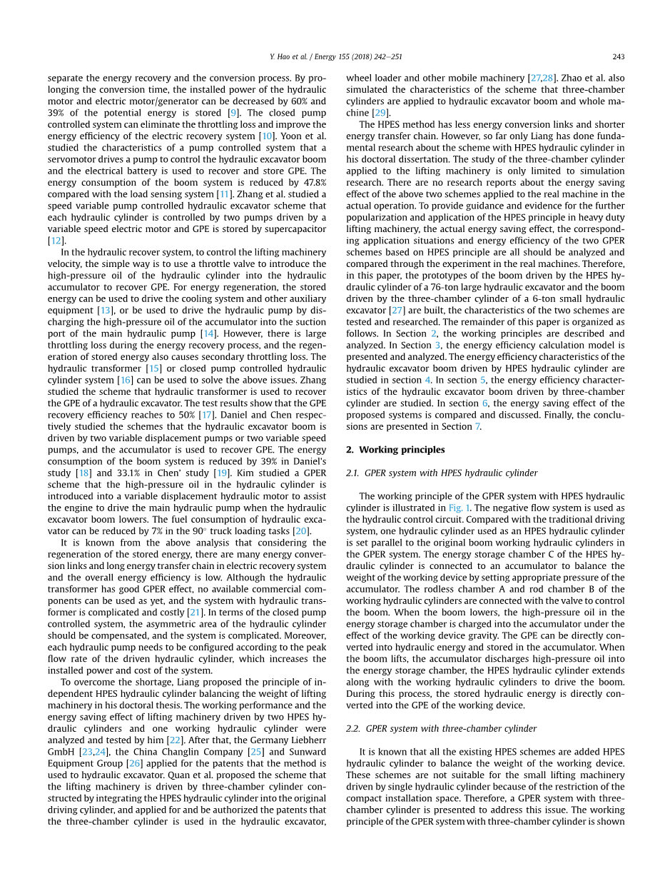 HPES方法的能量转换环节较少,能量传递链较短。然而,到目前为止,只有Liang在他的博士论文中对HPES液压缸方案进行了基本研究。三室缸应用于起重机械的研究仅限于仿真研究。以上两种方案在实际运行中应用于实际机器的节能效果还没有研究报道。为了为HPES原理在重型起重机械中的进一步推广和应用提供指导和依据,需要通过在实际机械上的试验,对两种基于HPES原理的GPER方案的实际节能效果、相应的应用情况和能源效率进行分析和比较。因此,本文研制了一台76吨大型液压挖掘机HPES液压缸驱动的臂架样机和一台6吨小型液压挖掘机[27]三室缸驱动的臂架样机,并对两种方案的特点进行了试验和研究。本文的其余部分组织如下。第二节对工作原理进行了描述和分析。第三节提出并分析了能源效率计算模型。第四节研究了HPES液压缸驱动的液压挖掘机臂架的节能特性。第五节研究了三室缸驱动的液压挖掘机臂架的节能特性。第六节对所给系统的节能效果进行了比较和讨论。最后,第7节给出了结论。