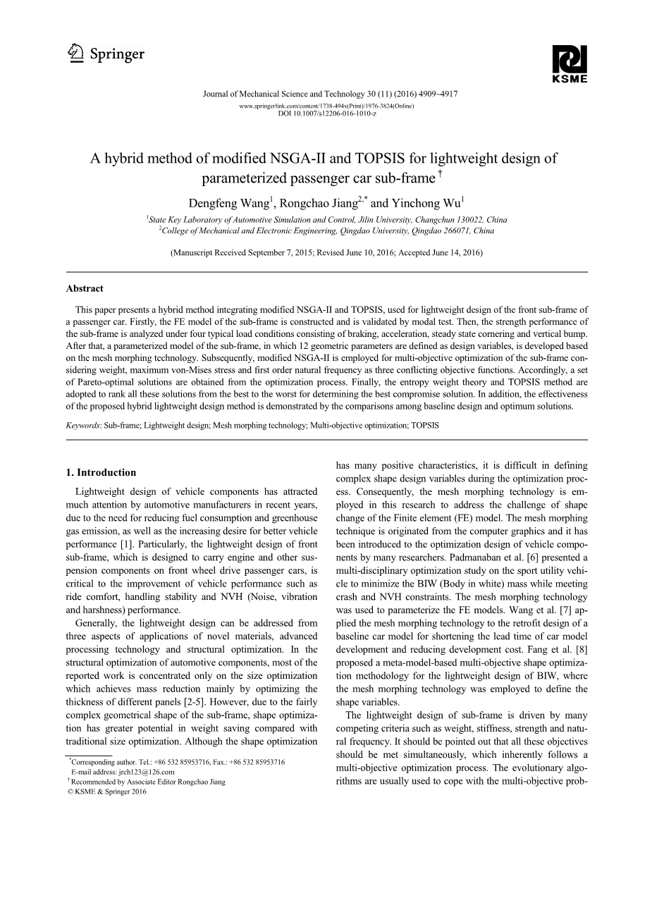 提出了一种改进的NSGA-II与TOPSIS相结合的参数化客车副车架重量轻量化设计方法外文翻译资料