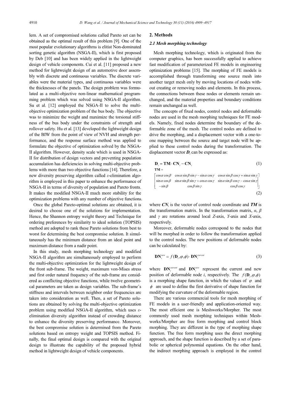 副车架的轻量化设计受到许多竞争标准的驱动,例如重量,刚度,强度和自然频率。应该指出的是,所有这些目标应该同时得到满足,其本质上遵循多目标优化过程。演化算法通常用于处理多目标问题。可以获得一组称为Pareto集的受损解决方案作为该问题的最优结果[9]。最流行的进化算法之一是精英非支配排序遗传算法(NSGA-II),它首先由Deb [10]提出,并已广泛应用于车辆部件的轻量化设计。崔等人[11]提出了一个新的具有离散和连续变量的汽车门组件的轻量化设计方法。离散变量是材料类型,连续变量是面板的厚度。设计问题被形成为使用NSGA-II算法求解的多目标非线性数学编程问题。苏等人。 [12]采用NSGA-II来解决公交车车身的多目标优化问题。目标是在强度和侧翻安全性的约束下最小化重量并最大化公共汽车车身的扭转刚度。胡等人[13]从NVH和强度性能的角度出发,开发了BIW的轻量化设计,并应用响应面法来制定NSGA?II算法解决的优化目标。然而,在NSGAII中用于设计向量分布和防止种群积累的密度尺度在解决具有两个以上目标函数的多目标问题时存在不足[14]。因此,本文采用了一种新的多样性保持算法,以提高NSGA-II在种群多样性和Pareto前沿方面的性能。它使修改后的NSGA-II对于具有任意数量目标函数的优化问题更加稳定。一旦获得全局Pareto最优解,就需要选择其中一个解决方案来实现。因此,采用Shannon熵权理论和通过相似理想解(TOPSIS)方法排序偏好的技术,将这些Pareto解决方案从最佳到最差排序,以确定最佳折衷解决方案。它同时具有距理想点的最小距离和距最低点的最大距离。