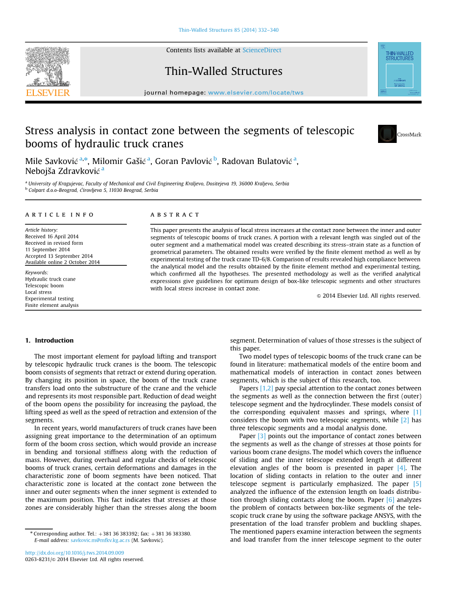 本文介绍了汽车起重机伸缩臂内外段接触区局部应力增加的分析。从外部区域中挑出具有相关长度的部分,并且创建描述其作为几何参数的函数的应力 - 应变状态的数学模型。通过有限元方法以及汽车起重机TD-6/8的实验测试验证了所得结果。结果的比较揭示了分析模型与通过有限元方法和实验测试获得的结果之间的高度一致性,这证实了所有假设。所提出的方法以及经过验证的分析表达式为盒状伸缩节段和其他结构的优化设计提供了指导,其中接触区域的局部应力增加。