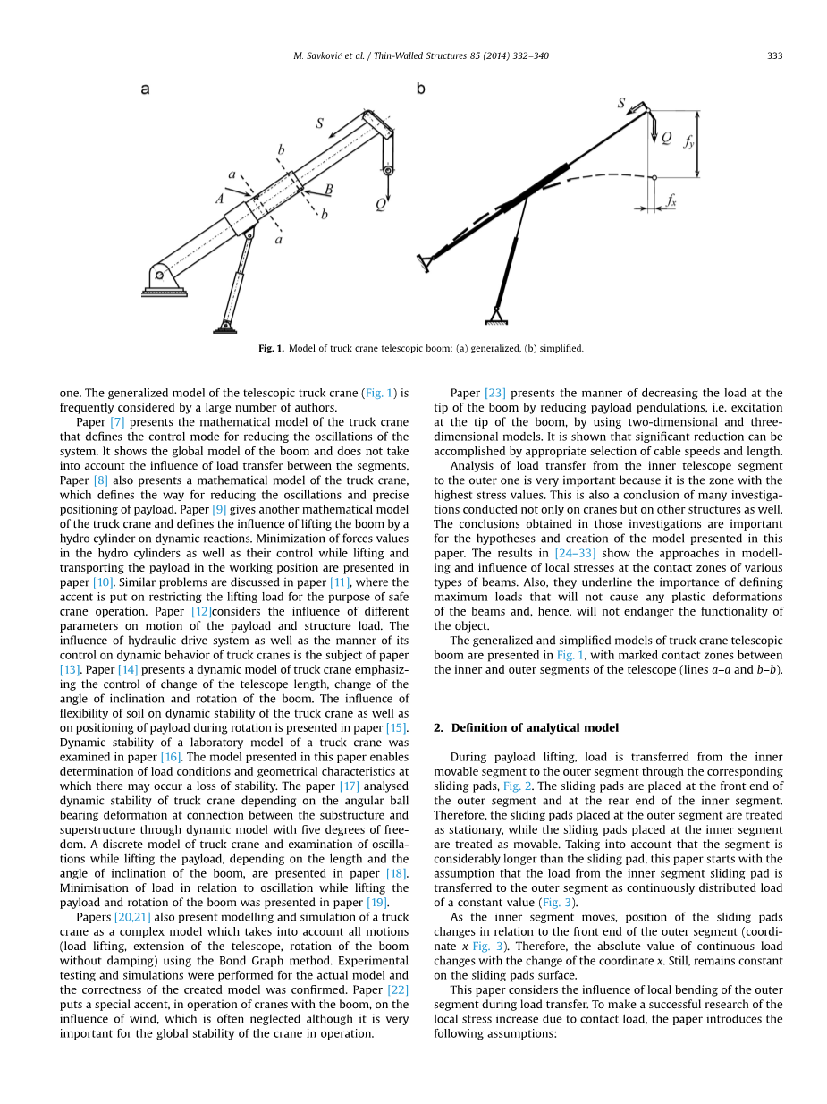 论文[1,2]特别注意伸缩吊臂各段之间的接触区以及第一节伸缩臂和液压油缸之间的连接。 这些模型由相应的等效质量和弹簧组成,其中[1]考虑具有两个伸缩节段的悬臂,而[2]具有三个伸缩节段并进行模态分析。