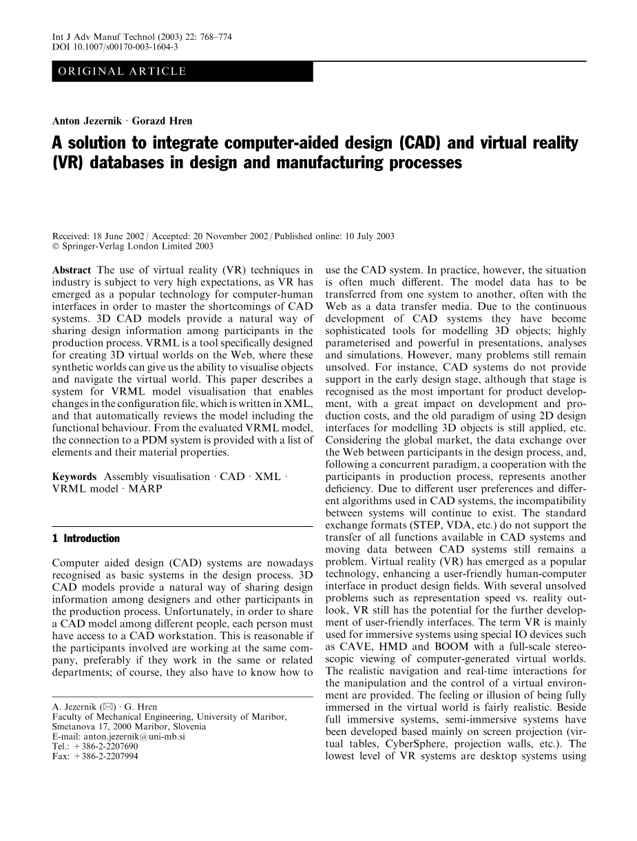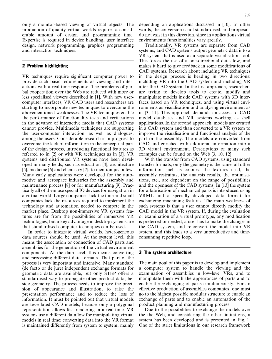 VR techniques require significant computer power to provide such basic requirements as viewing and interactions with a real-time response. The problems of global cooperation over the Web are reduced with more or less specialised viewers described in [1]. With new usercomputer interfaces, VR CAD users and researchers are starting to incorporate new techniques to overcome the abovementioned weaknesses. The VR techniques enable the performance of functionality tests and verifications in the advance of interactive media that CAD systems cannot provide. Multimedia techniques are supporting the user-computer interaction, as well as dialogues, among the users. Considerable research is in progress to overcome the lack of information in the conceptual part of the design process, introducing functional features as referred to in [2] or with VR techniques as in [3]. VR systems and distributed VR systems have been developed in many fields, such as education [4], architecture [5], medicine [6] and chemistry [7], to mention just a few. Many early applications were developed for the automotive and aerospace industries for the assembly and maintenance process [8] or for manufacturing [9]. Practically all of them use special IO devices for navigation in a virtual world. Large companies lack the time and small