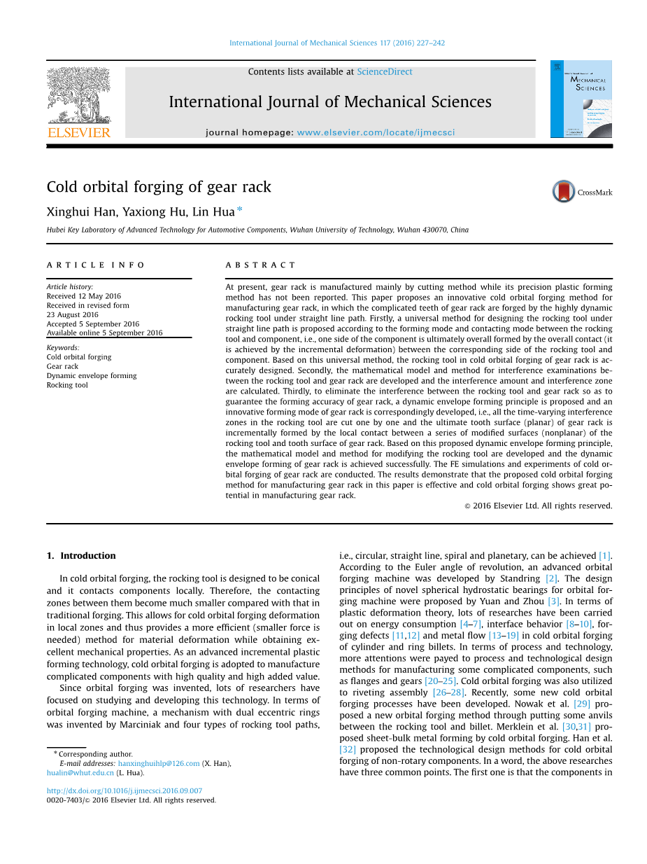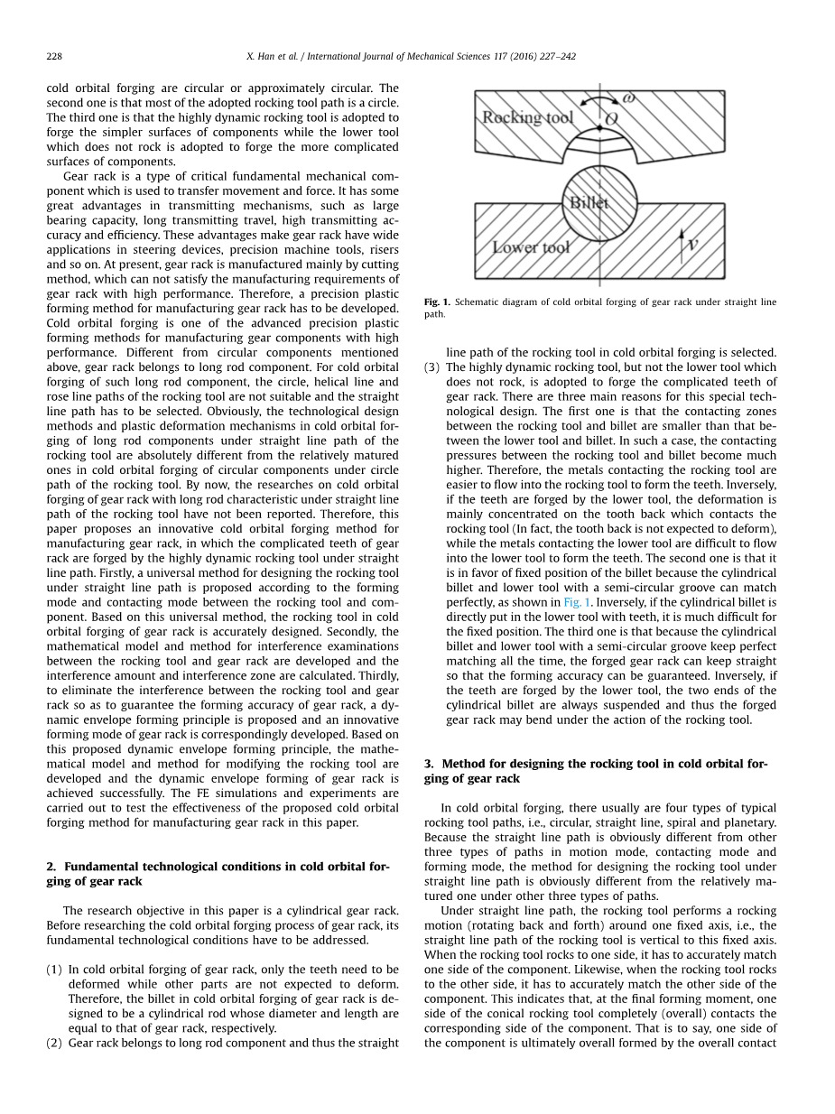 在冷轨道锻造中,摇摆工具设计成圆锥形它在本地联系组件。因此,联系它们之间的区域变得比那些区域小得多传统锻造。这允许冷轨道锻造变形在局部区域,从而提供更有效(更小的力量材料变形的方法,同时获得优异的机械性能。作为先进的增量塑料采用成形技术,冷轨道锻造制造复杂的部件具有高品质和高附加值。自从发明了轨道锻造以来,许多研究人员已经发明了这种方法专注于研究和开发这项技术。就轨道锻造机而言,双偏心环机构由Marciniak和四种类型的摇摆工具路径发明,即圆形,直线,螺旋和行星,可以实现。根据欧拉转角,先进的轨道锻造机由Standring]开发。该设计用于轨道锻造的新型球形静压轴承的原理机器由袁和周提出。就塑性变形理论而言,已经进行了大量的研究能耗,界面行为,锻造冷轨道锻造中的缺陷和金属流圆柱和圆钢坯。在流程和技术方面,对工艺和技术设计给予了更多的关注制造一些复杂部件的方法,例如作为法兰和齿轮。还使用了冷轨道锻造铆接组件。最近,一些新的冷轨道锻造工艺已经开发出来。诺瓦克等人提出通过放置一些铁砧进行新的轨道锻造方法摇摆工具和方坯之间。 Merklein等提出通过冷轨道锻造形成板状金属。韩等人提出了冷轨道的技术设计方法锻造非旋转部件。总之,上述研究有三个共同点。第一个是组件冷轨道锻造是圆形或近似圆形的。第二个是大多数采用的摇摆工具路径都是圆形。第三个是采用高动态摇摆工具。在下部工具的同时锻造更简单的部件表面采用不摇滚的方式来制造更复杂的东西组件表面。齿条是一种关键的基本机械部件用于传递运动和力量。它有一些传输机制的巨大优势,如大承载能力强,传动距离长,传动精度高和效率。这些优点使齿轮齿条宽阔在转向装置,精密机床,立管中的应用等等。目前,齿条主要是通过切割制造的方法,不能满足制造要求高性能齿轮架。因此,精密塑料必须开发用于制造齿条的成形方法。冷轨道锻造是先进的精密塑料之一制造高齿轮部件的方法性能。与提到的圆形组件不同以上,齿条属于长杆组件。对于冷轨道锻造这种长杆部件,圆,螺旋线和摇摆工具的玫瑰线路径不适合直线必须选择行路径。显然,技术设计冷轨道锻造的方法和塑性变形机理长杆部件在直线路径下的应用摇摆工具与相对成熟的绝对不同圆形下圆形部件的冷轨道锻造摇摆工具的路径。到目前为止,关于冷轨道的研究在直线下锻造长杆特性的齿条还没有报道摇摆工具的路径。因此,这论文提出了一种创新的冷轨道锻造方法制造齿轮齿条,其中齿轮齿轮复杂机架由高度动态的摇摆工具直接锻造而成线路。首先,设计摇摆工具的通用方法根据成形方法提出了直线路径