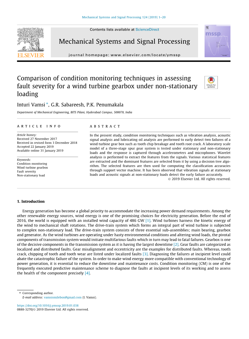 能源生成已成为满足不断增长的电力需求要求的全球优先事项。之间其他可再生能源,风能是发电的有前途的选择之一。在结束之前2016年,全球装机容量为486GW。风力涡轮机利用动能风向机械轴旋转。形成风力涡轮机的组成部分的传动系统受到影响复杂的非固定负载。传动系统由三个基本的子组件组成;主轴承,变速箱和发电机。由于风力涡轮机在仓促的环境条件下运行并且改变风荷载,因此是关键传输系统的组件会引发各种各样的故障,这反过来可能导致致命的故障。变速箱就是其中之一因为它具有最大的停机时间,因此传输系统中的决定性组件。齿轮故障分类为局部和分布式故障。齿轮不对中和偏心是分布式故障的例子。然而,牙齿局部缺陷下列出了裂纹,齿和齿的磨损。诊断初期的故障可以减轻系统的灾难性故障。为了使风能更加兼容传统技术发电,必须减少停机时间和维护成本。状态监测就是其中之一经常执行的预测性维护方案,以诊断其工作初期的故障并进行评估组件的健康状况。