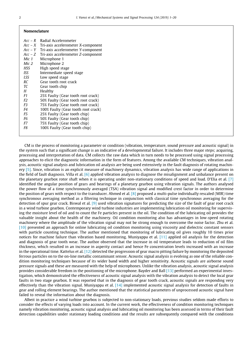 CM是监控参数或条件(振动,温度,声压和声信号)的过程系统使得重大变化表明发育失败。它包括三个主要步骤;收购,处理和解释数据。CM收集原始数据,而原始数据又需要使用信号处理进行处理以特征的形式引出诊断信息的方法。在可用的CM技术中,振动分析,声学信号分析和润滑油分析正广泛用于旋转机械的故障诊断。由于振动是机械动力学的明确测量,振动分析具有广泛的应用范围故障诊断领域。维拉等人。应用振动分析来诊断存在的不对中和不平衡行星齿轮箱转子轴在非静止的速度和负载条件下运行时。D#39;Elia等人。使用振动信号识别行星齿轮箱的齿轮和轴承的角位置。作者分析说时间同步平均(TSA)振动信号和修正波峰因数的功率流以确定齿轮相对于传感器的位置。艾哈迈德等人。提出了一个多脉冲单独重新调整(MIR)时间同步平均法作为滤波技术与经典时间同步平均相结合检测正齿轮裂纹。Biswal等人。使用振动特征来预测齿轮根部裂纹的大小在风力涡轮机变速箱中。当代风力涡轮机行业正在实施润滑油监测,以监督油的水分含量并计算油中在的Fe颗粒。润滑油的状况提供了关于机器健康的宝贵见解。油状态监测在低速旋转方面也具有优势振动信号幅度可能不足以克服噪声因素的机械。朱等人提出了一种使用粘度和介电常数传感器进行在线润滑油状态监测的方法用粒子计数技术。作者提到润滑油的监测大约是之前的10倍机器故障的通知比基于振动的监控。Muniyappa等。应用油分析进行检测齿轮磨损的诊断和诊断。作者观察到油温的升高导致油膜减少厚度导致粗糙接触增加,因此Fe浓度水平随着增加而增加在运营时间Kattelus等。通过监测沉积物来检测齿轮宏观点蚀失败的进展铁粒子到在线金属污染物传感器上。声学信号分析由于其更宽的带宽和更高的灵敏度而发展成为可靠的状态监测技术之一。声信号是空气声压力信号和这些是在麦克风的帮助下测量的。与振动分析,声学信号分析不同为麦克风的定位提供了相当大的自由度。Bayder和Ball进行了一项实验研究,证明了声学信号分析与振动分析检测局部齿轮的有效性两级变速箱故障。据报道,在齿轮齿裂纹的诊断中,声信号响应很快有效地比振动信号。Muniyappa等。实施声学信号分析以检测故障齿轮和滚动轴承。作者提到未经处理的声信号的统计参数有未能透露有关诊断的信息。