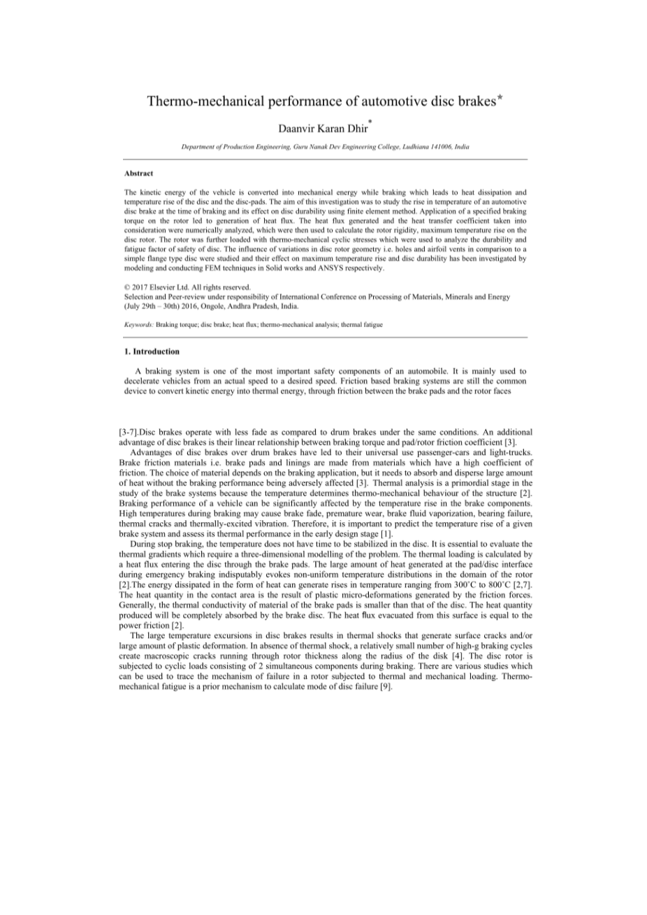 摘要 :汽车的动能在制动过程中转化为机械能,从而使制动盘和制动衬块温度升高并产生热耗散。本研究的目的是利用有限元分析法研究汽车盘式制动器制动时的温度升高状况及其对制动盘耐久性的影响。在制动盘上施加一定的制动力矩会产生热流。在考虑所产生的热流密度及相应的换热系数的情况下,对其进行数值分析,并将分析结果用于计算盘式制动器的刚度和最大温升。用热机械循环应力加载制动盘,分析制动盘的耐久性和安全疲劳系数。采用实体工程建模和ANSYS有限元分析技术,研究了与简单翼型制动盘相比,制动盘几何形状(钻孔和翼型通风口)的变化对制动盘最大温升和耐久性的影响。