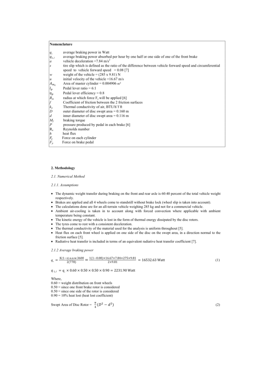 术语 q˳ 平均制动功率以瓦计量 q(˳) 前制动器的一半或一面每小时所吸收平均制动功率 a 汽车减速度 =7.84 m/s2 s 轮胎滑移率的定义为车辆前进速度与周向速度之差与车辆前进速度之比=0.08 w 整车质量=(285x9.81)N u 汽车初速度=16.67m/s Amc 主缸面积=0.004906m2 lp 脚踏杠杆比率=6:1 eta;p 脚踏杠杆效率=0.8 Rm 作用于Fc的力的半径 f 两个摩擦面之间的摩擦系数 ka 空气导热性,BTU/h*f ft D 制动盘扫掠面积的外径=0.160m d 制动盘扫掠面积的内径=0.116m Mf 制动力矩 P 每个刹车踏板产生的压力 Re 雷诺数 h 热通量 Fc 每个气缸上的力 Fp 制动踏板力 |