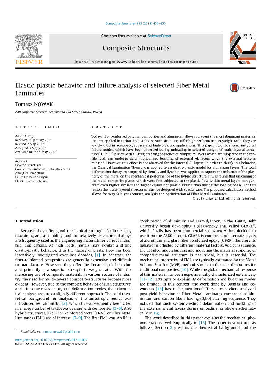 由于金属合金具有良好的机械强度,易于加工和装配,且价格相对低廉,因此常被用作各种工业应用的工程材料。在高载荷下,金属可能表现出很强的弹塑性性能。因此近几十年来,人们对塑性流动理论进行了深入的研究[1]。与之相比,纤维增强复合材料通常是昂贵和难以制造的,然而,它们能提供线性弹性性能,和首要的优越的强度重量比。随着复合材料越来越多的应用在工业各个领域,对多层复合材料结构的需求也越来越明显。然而,这种结构的复杂行为,以及在某些情况下的非典型变形模式,使得它们的理论分析需要稍微不同的方法。Lakhnitskii[2]介绍了各向异性体分析的坚实理论背景,这一点随后被大量有关复合材料的教科书[3-6]所引用。此外,混合结构如纤维增强金属(FRM)或纤维金属层压板(FML)也很受关注[7-9]。第一代FML是Arall,它是铝和芳纶/环氧树脂的混合物。20世纪80年代,代尔夫特大学开始开发一种叫做GLARE的玻璃/环氧树脂纤维金属层板,这种层板最终由空客公司决定在A380飞机上使用它,此时这种材料终于商业化了。GLARE层板由铝和玻璃纤维增强环氧树脂(GFRP)交替层组成,其性能会受到不同材料类型的影响。因此,深入理解复合金属结构材料响应和建模是非常必要的。FMLs的力学性能通常用金属体积分数法(MVF)估算,类似于传统复合材料的混合物规则[10]。虽然广泛的实验已表明[11–12]这种材料的整体机械响应,但对其变形和屈曲模式的解释是有限的。在这种情况下,比尼亚[13]和他的同事所做的实验必须提及。他们分析了具有(0/90)堆叠顺序的铝和碳纤维组成的纤维-金属层压板的后屈服现象。他们发现,这些系统在卸载过程中会呈现出外部金属层的分层和屈曲,如图1所示。