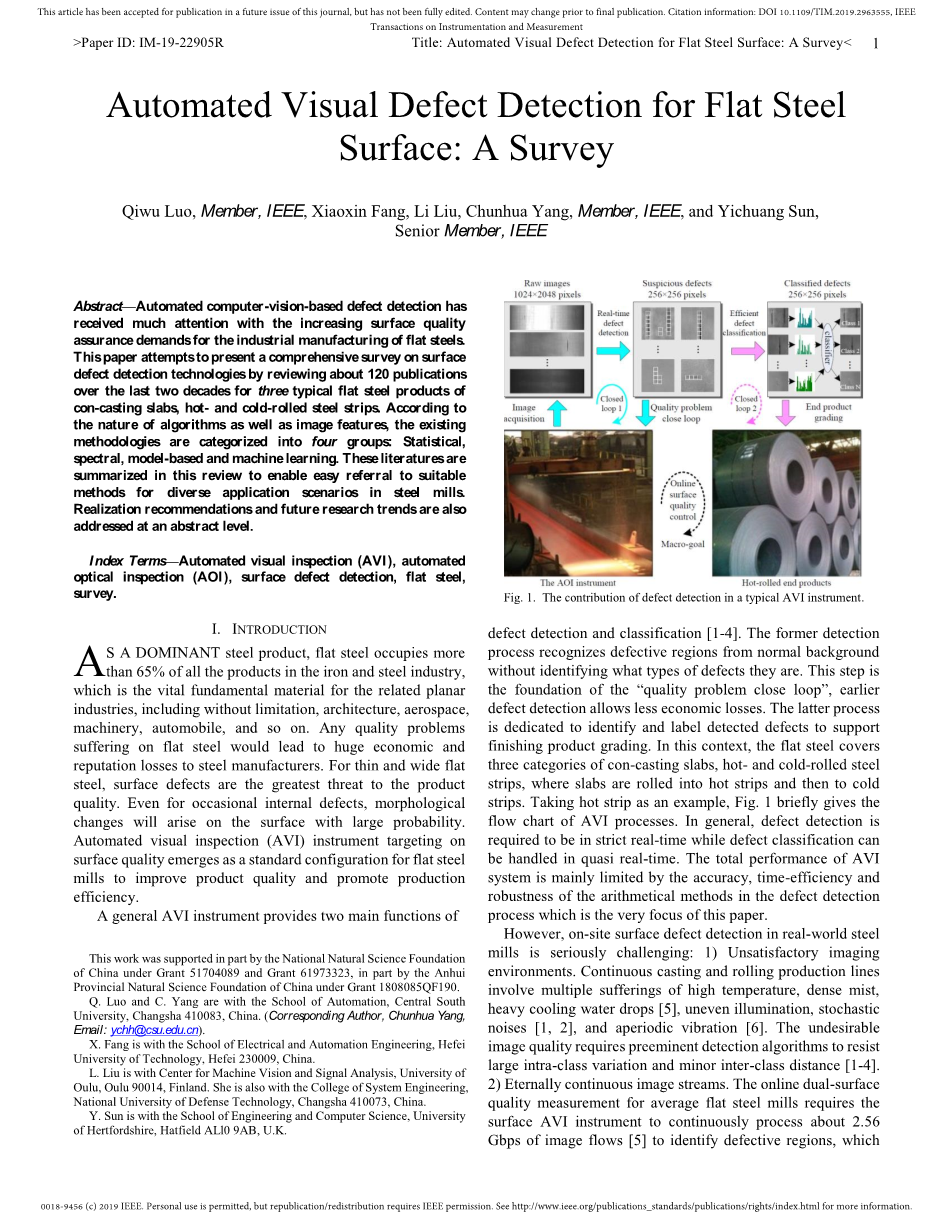 关键词:自动视觉检测(AVI);自动光学检测(AOI);表面缺陷检测;扁钢;综述
