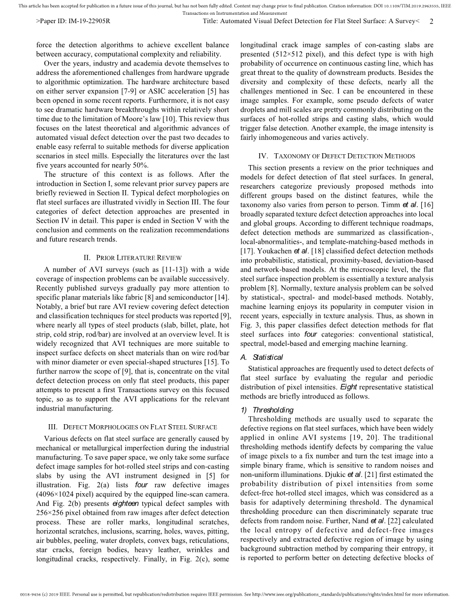 这个上下文的结构如下。在第一节的介绍之后,第二节简要回顾了之前的一些相关调查论文。扁钢表面典型的缺陷形貌在第三节中有详细的描述。第四节详细介绍了四类缺陷检测方法。第五部分是本文的结语,并对实现的建议和未来的研究方向进行了总结和评述。