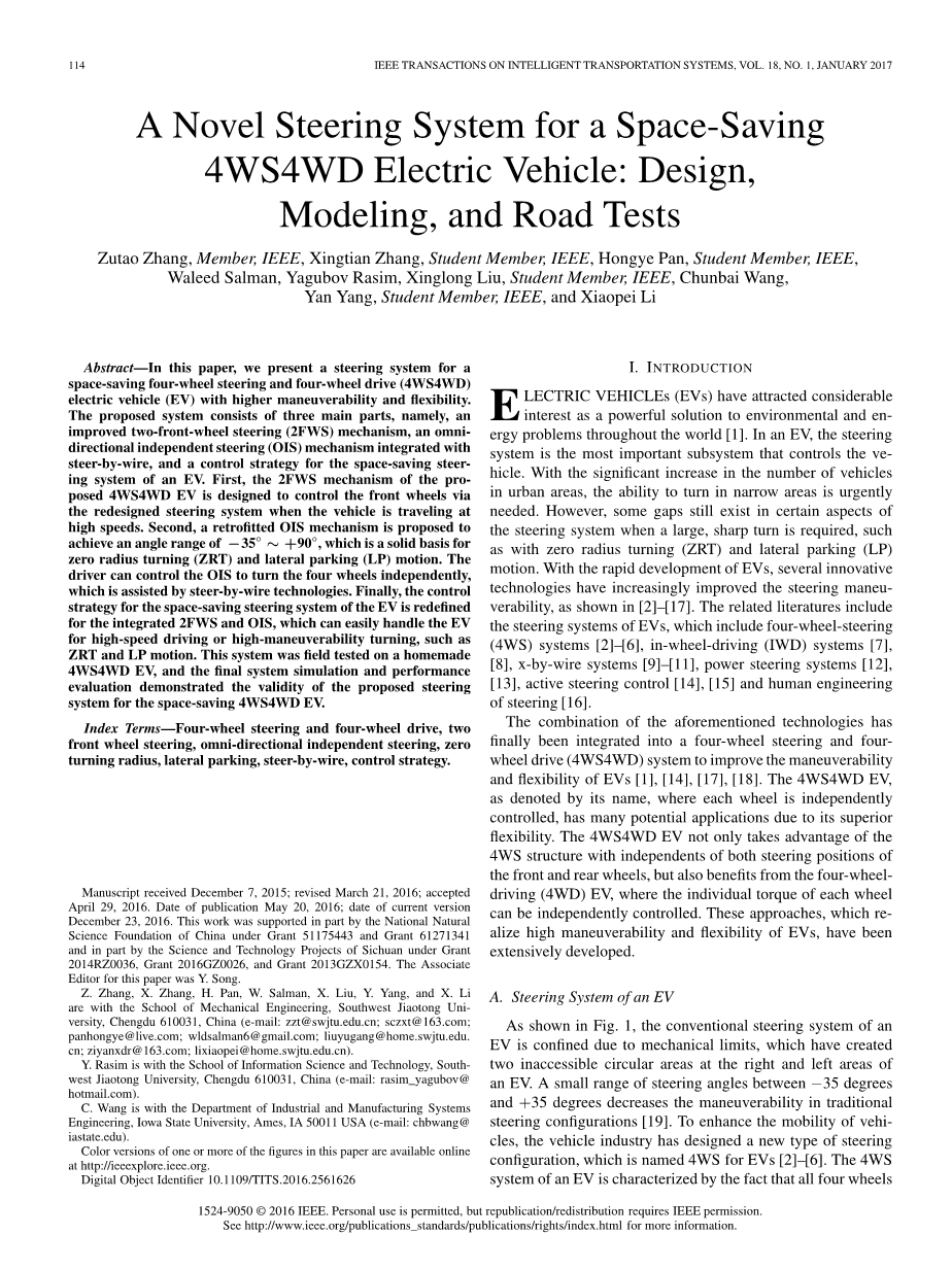 一种节省空间的4WS4WD电动汽车的新型转向系统:设计,建模和道路试验