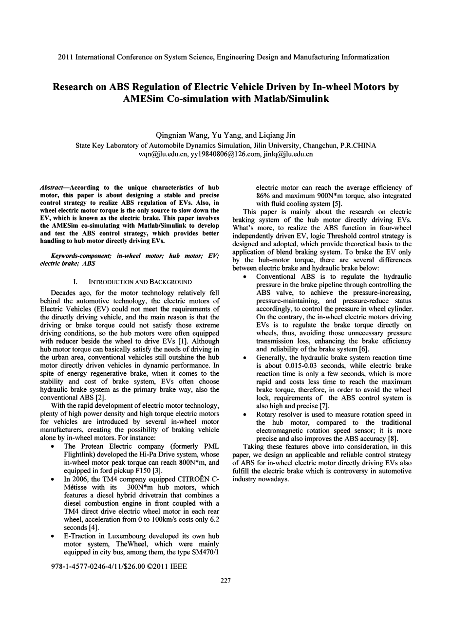 根据轮毂的独特特性电机,本文是关于设计一个稳定、精确的实现电动汽车ABS调节的控制策略。此外,在车轮电机扭矩是唯一能减缓电动汽车,这就是所谓的电动制动器。这篇论文涉及利用Matlab/Simulink进行AMESIM协同仿真开发并测试了ABS控制策略,提供了更好的直接驱动电动汽车的轮毂电机的操作。