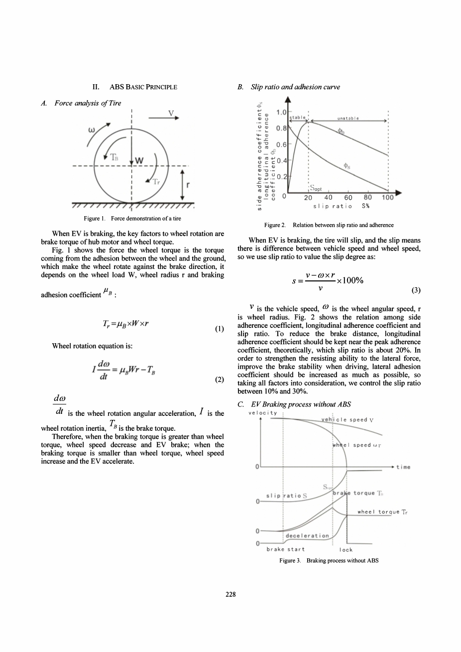 图3显示了制动过程; 制动扭矩时通过轮毂电机应用于车轮,车轮速度开始同时减小,同时滑移率S和车轮扭矩开始增加。 在滑移率达到S o P t之前,车轮扭矩Tr和制动扭矩TB同步上升; 但在经过某一时刻制动扭矩TB继续上涨,车轮扭矩不会增加而是减小,制动扭矩和车轮扭矩之间的差异迅速上升,导致车轮的滑移率迅速增大,甚至导致车轮锁定。 ABS的目标是控制滑动率使其维持在Sopt即最佳滑移率附近,充分利用依从性,最大化制动扭矩,减少制动距离,并保持侧向粘附系数足够高,以改善电动汽车在制动过程中的稳定性和操控性。