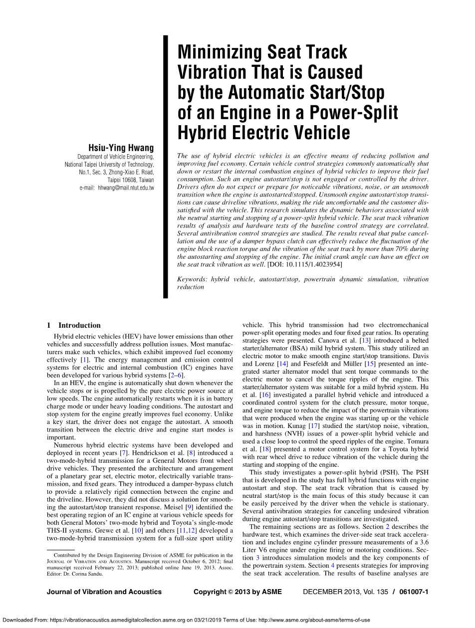 最大限度地减少动力分流混合动力汽车中发动机自动启动/停止引起的座椅轨道振动外文翻译资料