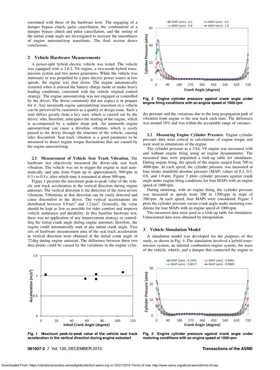 图1显示了发动机自动启动期间车辆座椅轨道加速度在垂直方向上的最大峰 - 峰值。垂直方向是最剧烈振动的方向。可以容易地检测到该方向上的振动并且引起驾驶员的不适。垂直加速度分布在0.9m / s2和1.2m / s2之间。通常,该值应保持尽可能低的骑行者舒适度并改善车辆耐久性和耐久性。在此基线硬件测试中,在发动机自动启动期间没有应用任何改进策略或控制初始曲柄角;因此,发动机可以在任何初始曲柄角度自动启动。在发动机自动启动期间,在72度的初始曲柄角处获得了两组垂直方向上的座椅轨道加速度的硬件测量数据。这两个数据点之间的差异可能是由于发动机气缸压力的变化以及由于每次从发动机到座椅轨道的振动的长传播路径引起的变化引起的。差异大约为10%,并且在可接受的方差范围内。