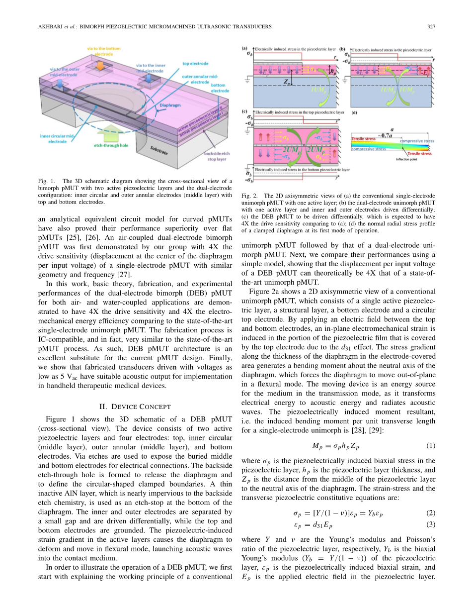 图1.三维示意图,示出了具有两个有源压电层和双电极配置的双晶片pMUT的横截面图:具有顶部和底部电极的内部圆形和外部环形电极(中间层)。