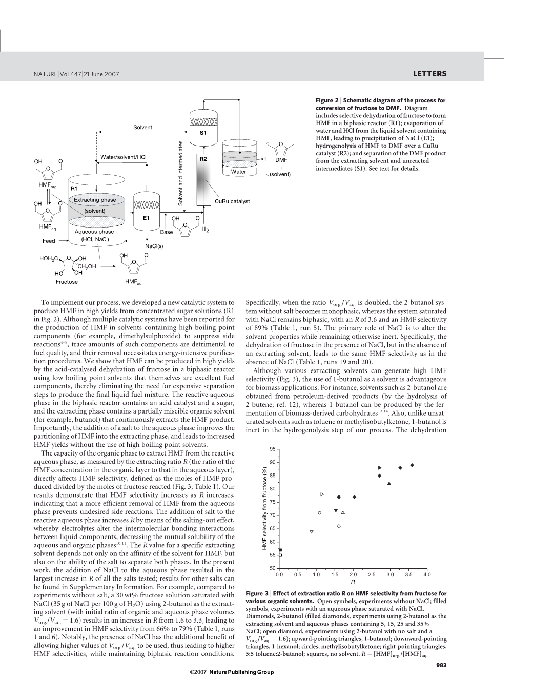 有机相从反应水相中提取HMF的能力,用萃取比R(有机层HMF浓度与水相HMF浓度之比)来衡量。(s层),直接影响HMF的选择性,定义为果糖反应的摩尔除以产生的HMF。我们的结果表明,HMF选择性增加了r增加,表明从水相中更有效地去除HMF可以防止不良的副反应。反应水相中盐的加入通过TH增加R。盐析效应,即电解质改变了液体组分之间的分子间键作用,降低了水相和有机相的相互溶解度。Rva对于特定的萃取溶剂,LUE不仅取决于溶剂对HMF的亲和力,还取决于盐对HMF和HMF的分离能力。在本工作中,NaCl的加入对水相而言,所有被测盐类的R值增加幅度最大;其他盐类的结果见“补充资料”。例如,与没有盐,以2-丁醇为萃取溶剂(有机相和水相体积比为Vorg./VAQ)的30%果糖溶液,以NaCl(每100 g H2O中35克NaCl)饱和。5 16)R从1.6增加到3.3,使HMF选择性从66%提高到79%(表1,运行1和6)。值得注意的是,NaCl的存在对al有额外的好处。Vorg./VAQ值较高。用于,从而导致较高的HMF选择性,同时保持两相反应条件。具体来说,当Vorg./VAQ。是双倍的,2-但是.不含盐的醇体系为单相,饱和NaCl的体系为两相体系,R为3.6,HMF选择性为89%(表1,运行5)。NaCl的主要作用是改变溶剂性质,同时保持惰性。具体来说,果糖在NaCl存在下脱水,但在没有萃取溶剂的情况下,在没有NaCl的情况下会导致相同的hmf可选性。