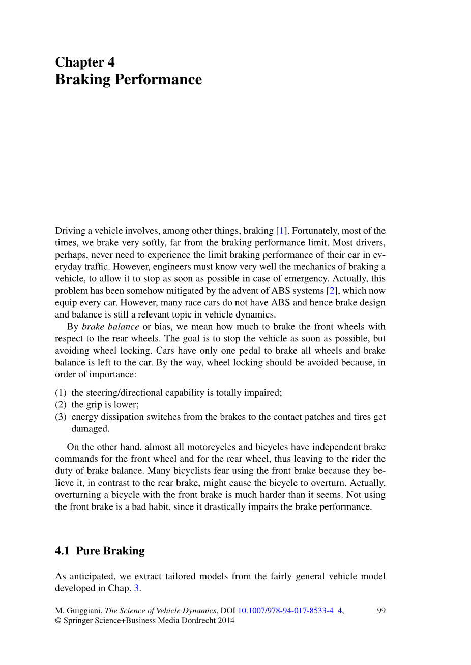 本章的目标是了解如何尽可能快的停车,避免车轮锁止。只有如果车辆有正确的制动平衡时才可以获得这个结果。不幸的是,制动平衡受到抓地力数值和质量中心的位置的影响。该主题已被细致的解决,无论是分析和图形,通过所有可能的制动区域条件解决了。方程式赛车的制动性能的独特之处也讨论过了。