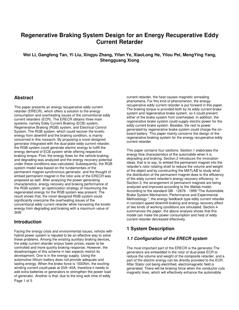 面对能源危机和环境问题,拥有混合动力系统的汽车被誉为解决这些问题的有效途径。在现有的辅助制动装置中,涡流缓速器享有盛誉,更容易控制并且更快速的制动响应。但是,这个方案有两个方面的缺点限制了它的发展。一个是能源供应。使用汽车锂电池不能提供充足和持久的能量。当制动力矩为1500Nm时,励磁绕组电流峰值可以达到20A〜40A,因此需要增加额外的电池或发电机来增强发电机的功率负荷。另一方面,由于涡流缓速器的工作时间长,热量会引起磁性退火现象。对于这种现象,本文提出了能量回收型涡流缓速器。制动力矩由涡流制动系统和再生制动系统提供,因此可以防止制动系统过热。此外,再生制动系统可以为涡流制动系统提供电力。本文主要关注能量回收型涡流缓速器再生制动系统的设计。