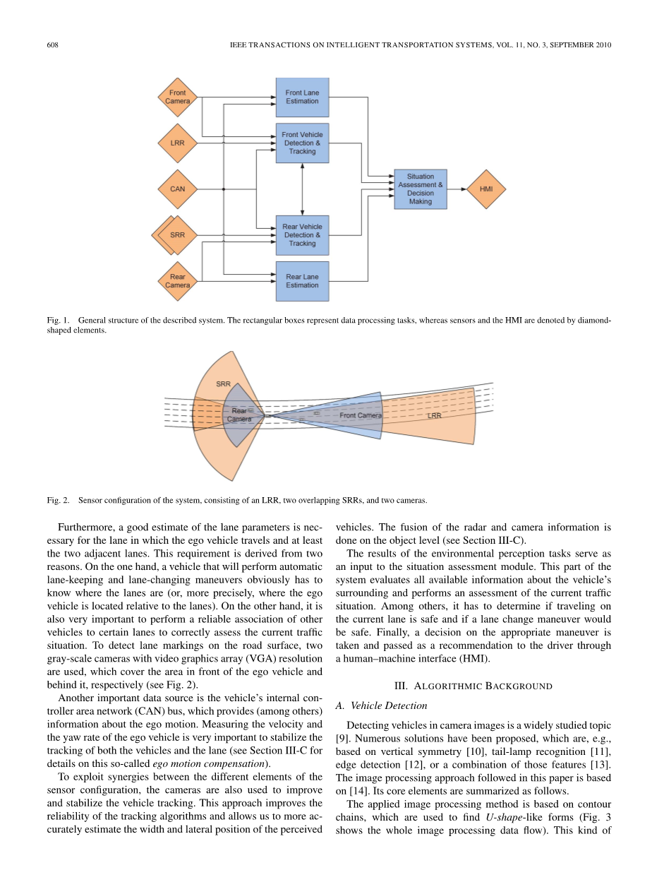 本文描述的系统的总体结构如图1所示。该图的元素来源于系统的感知要求。一方面,关于在本体车辆周围移动物体的了解是必要的,以避免碰撞。为此,在车辆前保险杠上安装了77-GHz远程雷达(LRR)和而在后端安装了两个24-GHz短程雷达(SRR)1