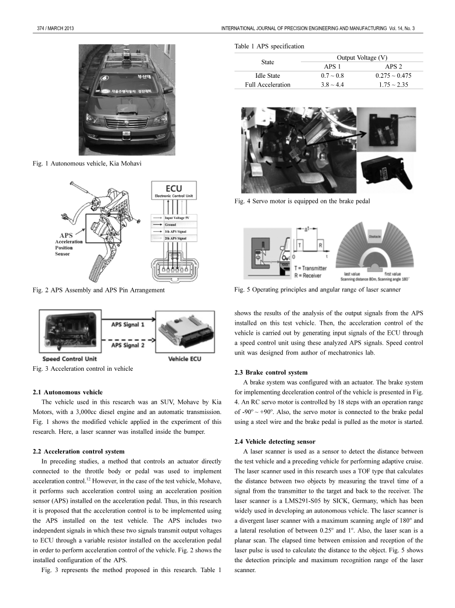 图3表示本研究中提出的方法。表格1显示了来自安装在这辆测试车上的APS的输出信号的分析结果。然后,通过使用这些分析的APS信号的速度控制单元产生ECU的输入信号来执行车辆的加速控制。速度控制单位是由机电一体化实验室的作者设计的。