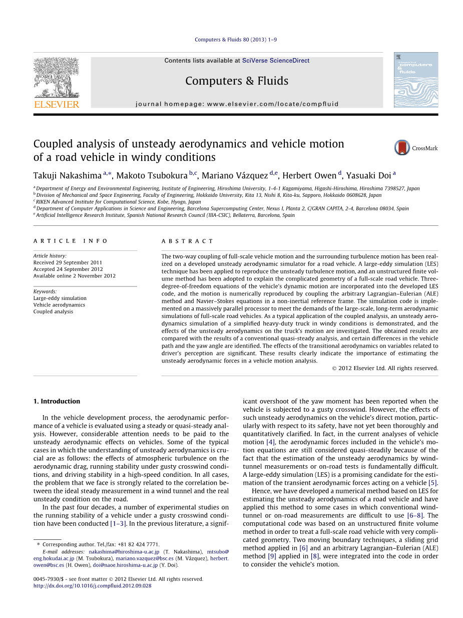 在过去的四十年中,已经进行了一系列关于车辆在阵风条件下运行稳定性的实验研究[1-3]。在之前的文献中,已经表明了当车辆受到阵风的侧风时横摆力矩的明显超调。然而,这种非定常空气动力学对车辆直接运动的影响,特别是其安全性方面的影响尚未完全和定量地说明。事实上,在当前对车辆运动的分析[4]中,车辆运动方程中包含的空气动力学仍然被认为是准静态的,因为通过风洞测量或路面测试对非定常空气动力学进行估算是非常困难的。大型涡流模拟(LES)是评估作用于车辆上的瞬态气动力的有希望的后备技术[5]。因此,我们开发了一种基于LES的数值方法来估算道路车辆的非定常空气动力学,并将这种方法应用于某些常规风洞或道路测量难以使用的情况[6-8]。计算代码基于非结构化有限体积法,以处理具有非常复杂几何形状的全尺寸道路车辆。考虑到车辆的运动[6]中应用的滑动网格方法和[8]中应用的任意拉格朗日欧拉(ALE)方法[9] 这两种移动边界技术被整合到代码中。