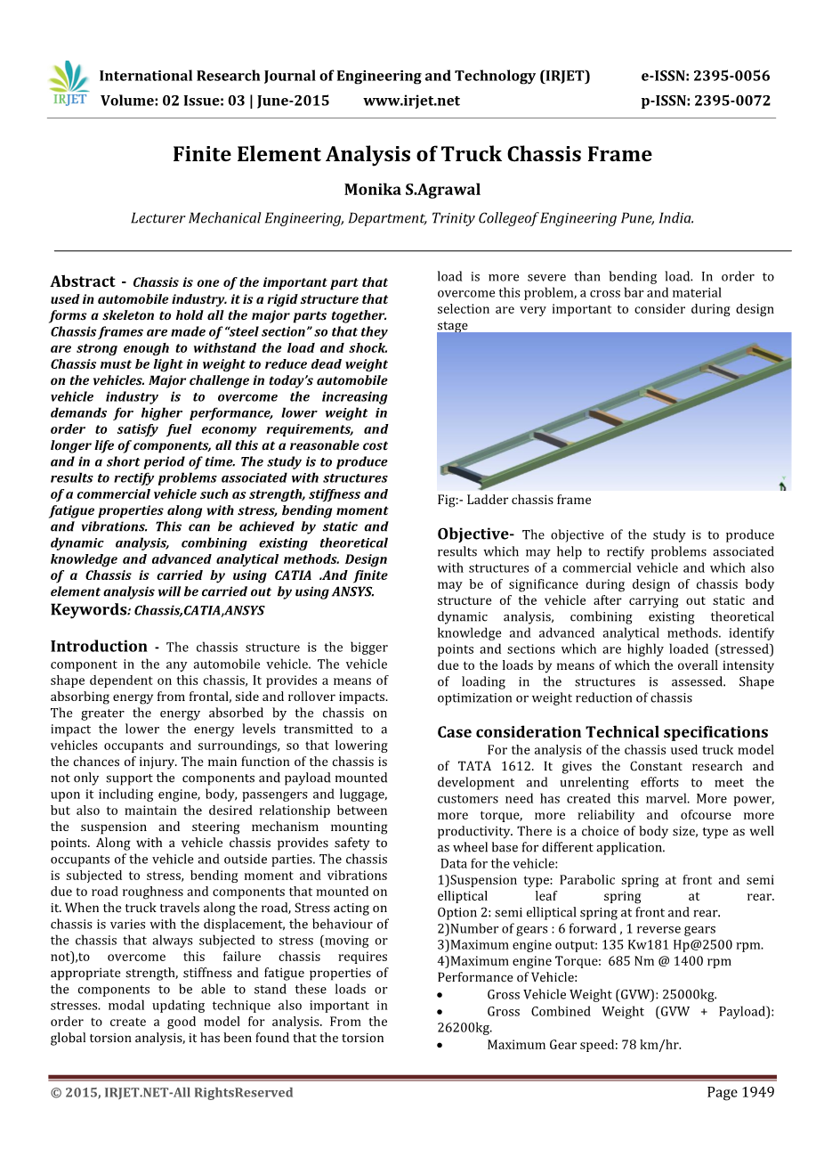 车架结构是一辆汽车中相对比较大的部件。车辆外形依赖于这个车架,它提供了一种方法从正面、侧面和翻转的影响中吸收能量。底盘吸收的能量越大影响到传递给车辆驾驶环境的能量就低,所以可以降低受伤害的机会。底盘的主要功能是不仅支持组件和负载,包括引擎,身体,乘客和行李,同时也要保持悬挂和转向机构安装点一定的位置关系。与汽车底盘车架一起为驾驶人和车辆外部部件提供安全。底盘受到压力,弯曲力矩和振动的影响由于道路粗糙度和安装在上面的部件。当卡车行驶在路上时。压力作用于底盘不同于位置,车辆不同的行为车架总是承受着各种压力(不管车辆是否运行),为了克服这个车架的不足,需要车架要有适当的强度,刚度和疲劳性能能够承受这些载荷的压力。模型的更新技术也很重要为分析建立一个良好的模型。从整体的扭转分析,发现了扭转负载比弯曲载荷更严重。为了克服这个问题,在设计阶段横梁和其材料的选择是非常重要的。