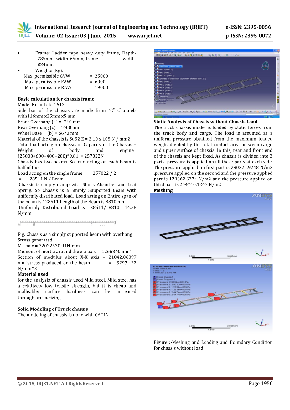 卡车车架模型静载荷是由的卡车车身和货物的质量。 负载假定为最大载荷获得均匀的压力重量除以货物之间的总接触面积和底盘的上表面。在这个后端和前端的底盘保持固定。由于底盘分为3个部分,在每一部分的一侧施加压力。第一部分施加的压力为290321.9248 N / m2,第二次施加的压力和施加的压力部分为129362.6374 N / m2并施加压力第三部分是244740.1247 N / m2